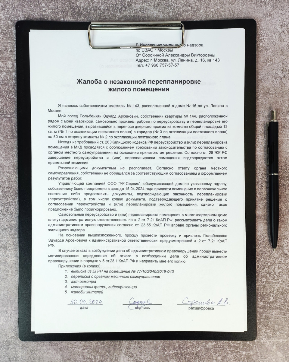 На фото показан официальный документ — жалоба о незаконной перепланировке жилого помещения, закрепленный на планшете с прижимной скобой, рядом лежит шариковая ручка. Текст содержит описание обстоятельств, ссылку на нормы законодательства и просьбу к надзорному органу провести проверку. Документ оформлен в деловом стиле и соответствует процедурам жилищного контроля. Изображение можно использовать в материалах о юридической защите прав жильцов, разъяснениях административных процедур и процессах подачи обращений в контролирующие органы.