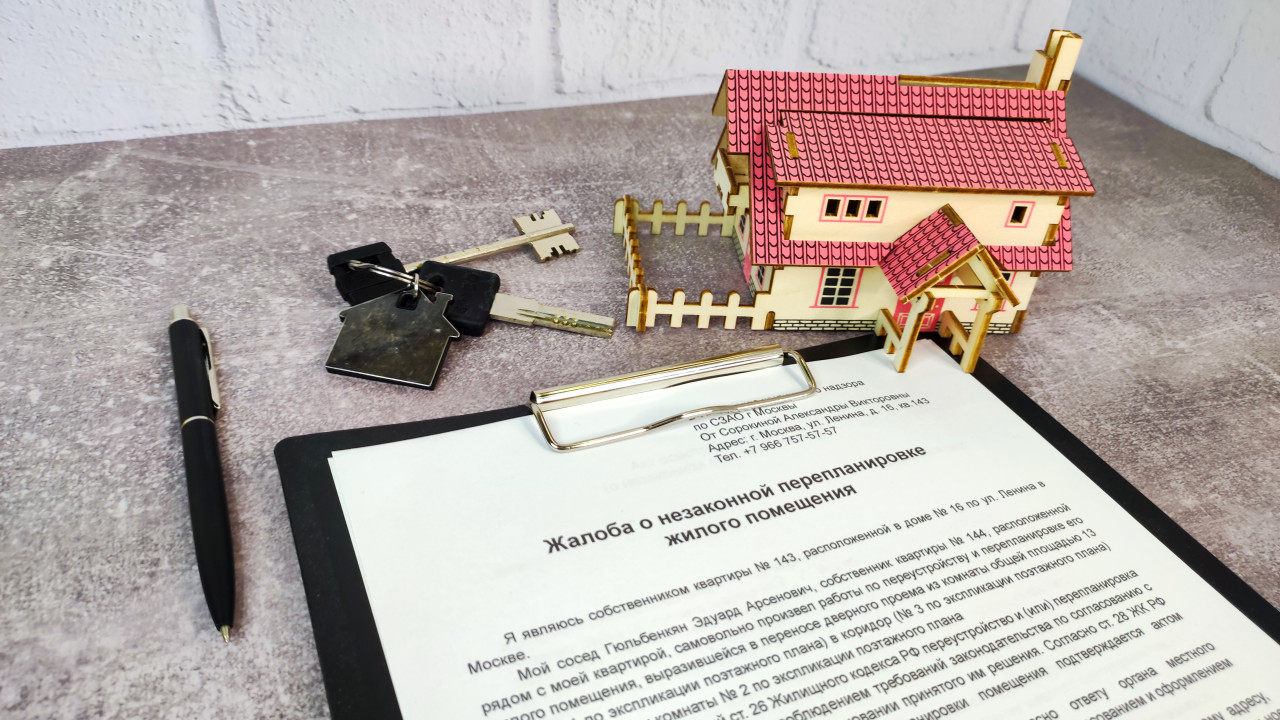 На фото изображены планшет с закреплённой жалобой о незаконной перепланировке, связка ключей на брелоке в форме дома, шариковая ручка и макет частного домика с декоративным забором. Документ оформлен в российском правовом формате и относится к процедурам жилищного надзора при нарушении норм перепланировки. Макет дома используется как символ жилой недвижимости, а ключи указывают на связь с вопросами владения или проживания. Такой снимок подходит для иллюстраций юридических публикаций о контроле за изменениями в жилых помещениях, консультаций по жилищным спорам и материалов о нормативных требованиях к перепланировкам.