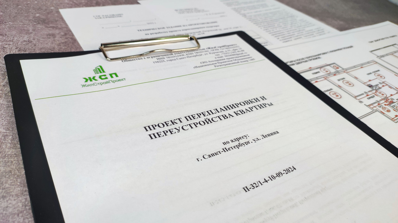 На снимке показана папка с проектной документацией по перепланировке квартиры, выполненной на русском языке и размещённой на планшете с зажимом на столе. На титульном листе видны реквизиты организации-проектировщика и указание на адрес объекта, что свидетельствует об официальной стадии согласования работ. На заднем плане лежат технические документы и схемы, содержащие текстовые блоки и чертежи. Такой материал используется для иллюстрации статей о градостроительной документации, подготовке проектной части, юридическом согласовании ремонта и сопровождении сделок с недвижимостью.