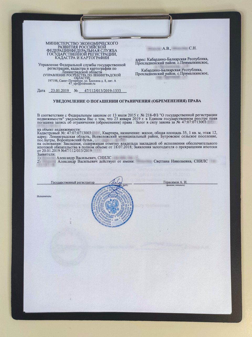 На фото показан официальный документ, выполненный на бланке федеральной службы регистрации, с подписью государственного регистратора и круглой гербовой печатью. Текст содержит сведения об объекте недвижимости и подтверждение снятия обременения. Бланк закреплён на планшете и расположен на светлой поверхности. Уведомления такого типа используются в сделках с недвижимостью и являются подтверждением правового статуса объекта. Изображение подходит для публикаций о регистрации недвижимости, юридических процессах и государственном кадастровом учёте.