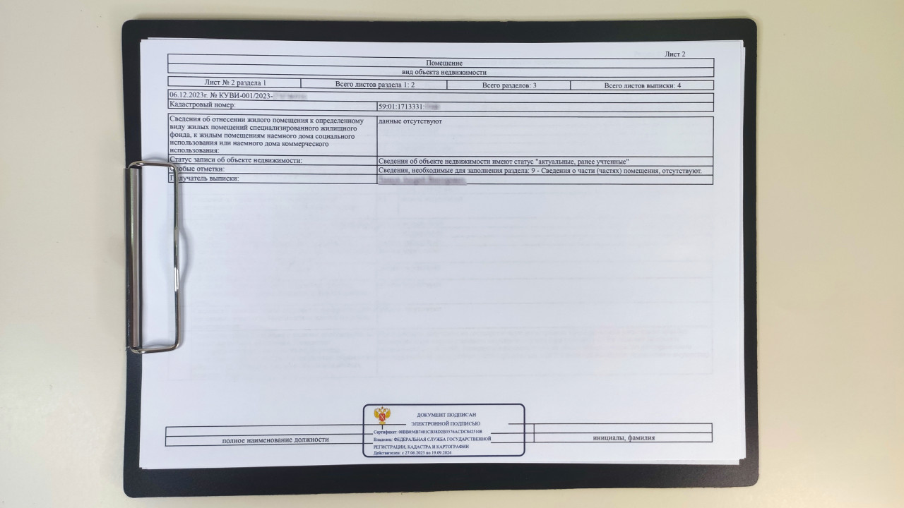 На фотографии запечатлён лист выписки из Единого государственного реестра недвижимости, прикреплённый к чёрному клипборду и лежащий на светло-бежевой поверхности. Документ содержит сведения о статусе жилого помещения и отмечает отсутствие ограничений или специальных условий использования, что характерно для объектов частного жилищного фонда. В нижней части размещён информационный блок о подписании документа электронной подписью территориального подразделения Росреестра. Кадр можно использовать в материалах о юридической проверке собственности, кадастровой информации и подготовке документов к сделкам.