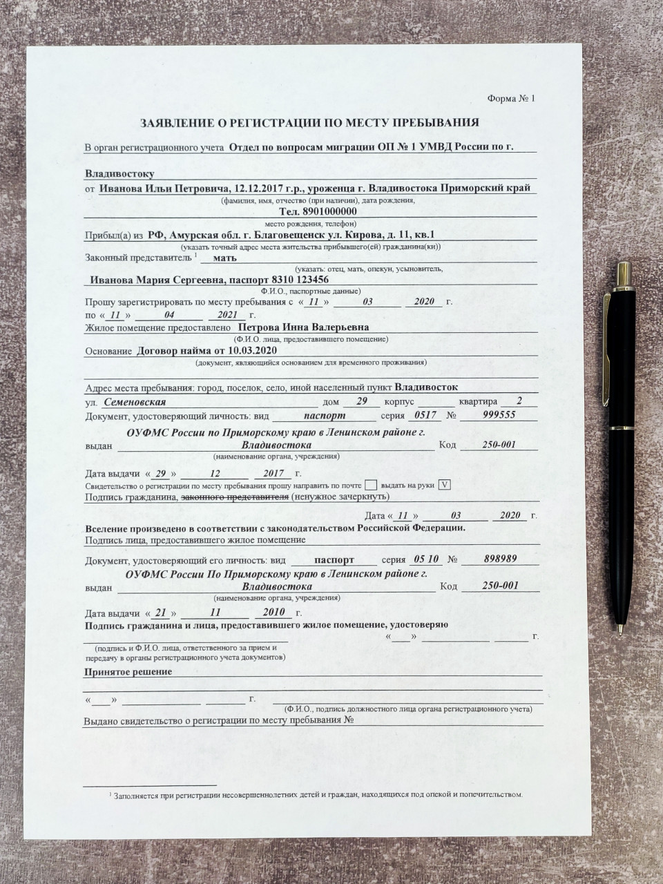 На изображении размещено заполненное заявление о регистрации по месту пребывания (форма №1), лежащее на поверхности с серым гранитным рисунком, рядом с черной шариковой ручкой. Документ выполнен на русском языке, содержит сведения о заявителе, адресе временного проживания и удостоверяющем документе. Такие заявления используются при постановке граждан на учет в органах МВД РФ при временном проживании. Кадр можно использовать в обучающих материалах, публикациях о миграционном учете, а также в инструкциях по заполнению официальных форм.