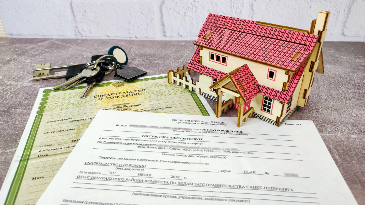 На фото запечатлен макет частного дома с декоративной крышей и ограждением, размещенный рядом со связкой металлических ключей и двумя документами — свидетельством о рождении и свидетельством по форме №8 о регистрации по месту жительства ребенка. Бумаги оформлены в российской юрисдикции и лежат на столешнице с фактурным покрытием. Изображение демонстрирует связь правового статуса несовершеннолетних с местом проживания и подходит для материалов о семейном и жилищном праве, разъясняющих порядок регистрации детей и оформление их адреса проживания.