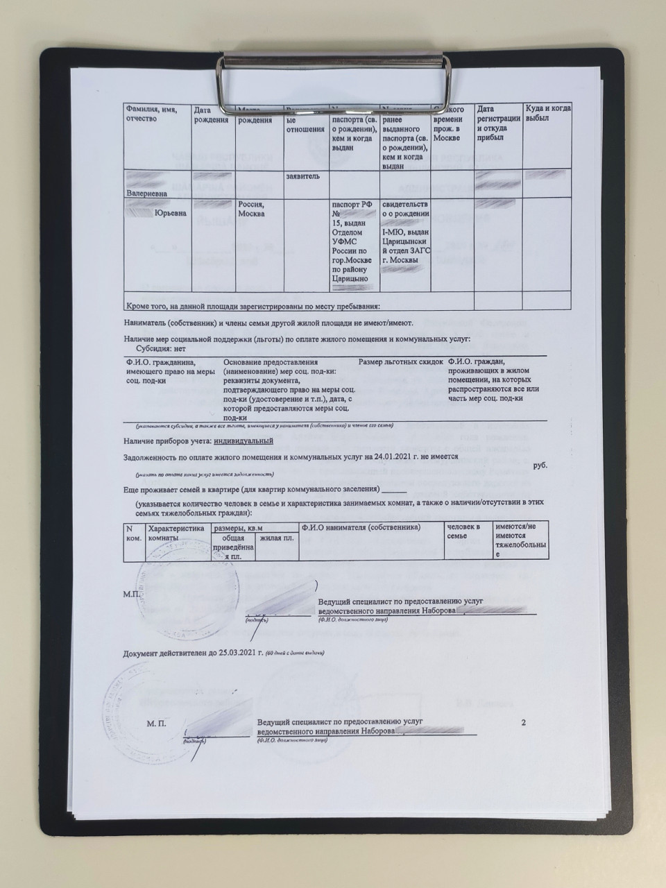 Жилищная справка с указанием зарегистрированных лиц на клипборде