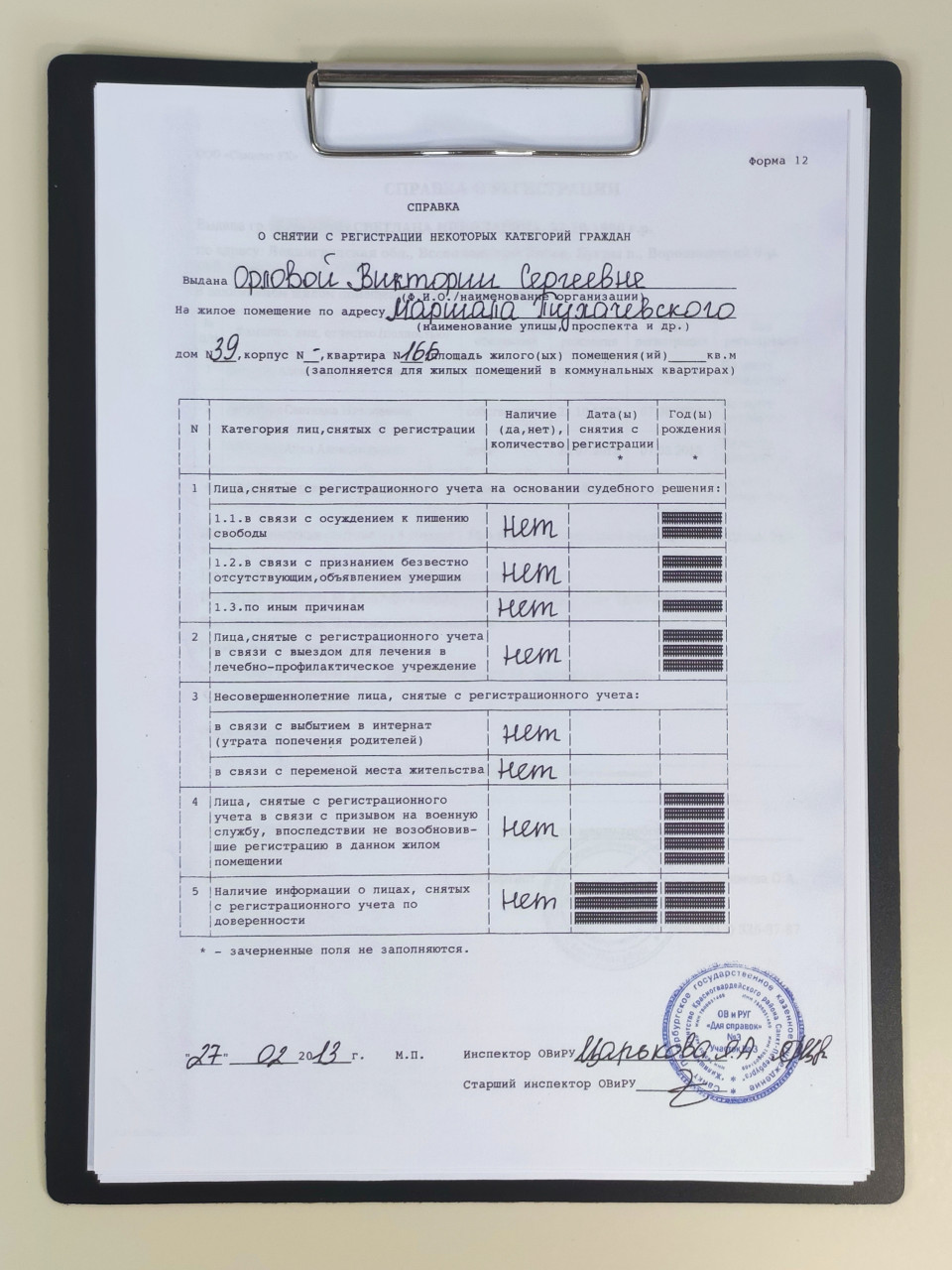 регистрация жильё недвижимость документ снятие с учета справка миграционный учет клипборд форма 12 таблица отметка подпись печать ведомственный акт учет населения правовой статус госслужба административная процедура юриспруденция учет граждан домовая книга муниципальный документ оформление бумажный бланк архивПохожие фотографии