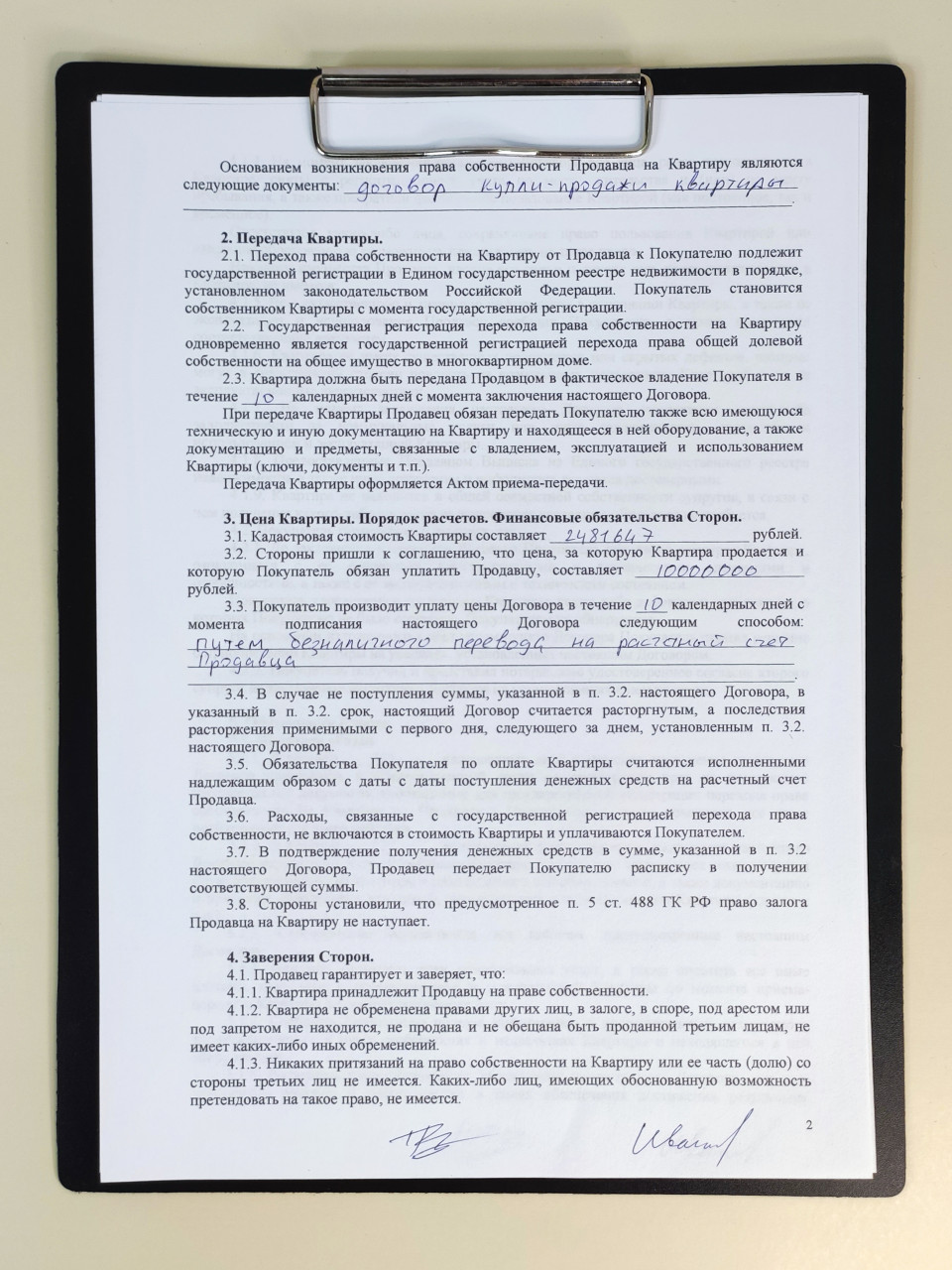 На изображении размещён лист договора, включающий условия перехода права собственности, порядок передачи квартиры и оплату согласно установленным пунктам соглашения. Документ закреплён на планшете, содержит выделенные рукописные вставки, отражающие индивидуальные условия сделки, и подписи сторон внизу страницы. Текст оформлен по правилам юридических документов и используется в имущественных сделках. Фото подходит для публикаций о правовом сопровождении недвижимости, примерах договоров и юридической практике.