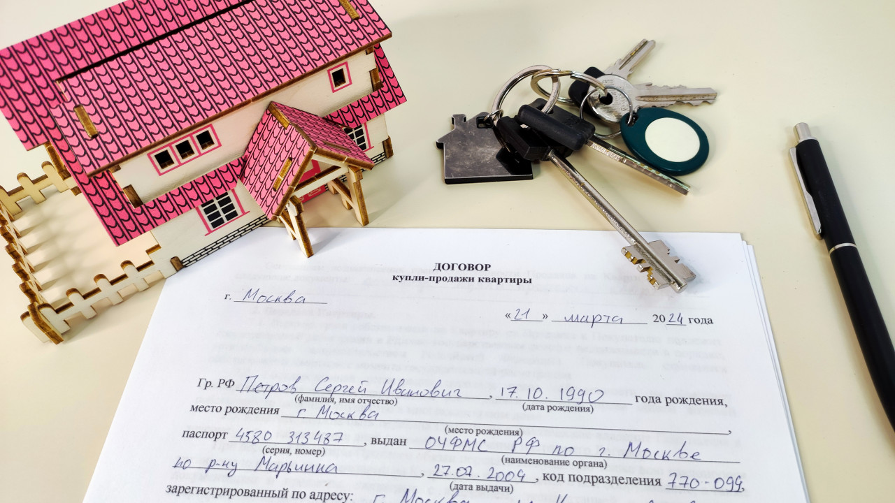 На изображении представлен лист договора купли-продажи квартиры, частично заполненный от руки, лежащий на светлой поверхности. Над документом расположена связка металлических ключей с брелоком, символизирующая передачу имущества. Слева в кадре виден миниатюрный макет загородного дома в розовой цветовой гамме, выполненный из дерева, что подчёркивает тематику недвижимости и оформления права собственности. Справа лежит шариковая ручка, используемая для подписания договора. Кадр можно применять в иллюстрациях к материалам о продаже жилья, юридических этапах оформления, вопросах собственности и сопровождении сделок.