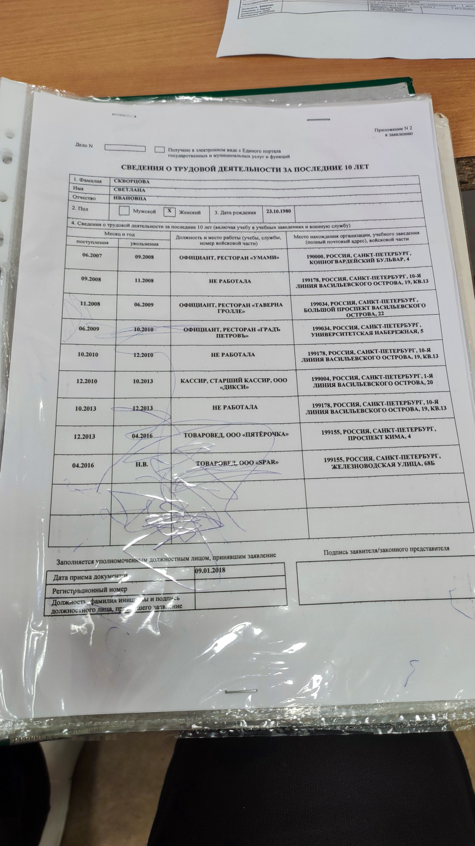 На изображении представлен документ с таблицей «Сведения о трудовой деятельности за последние 10 лет», заполненный от руки. В таблице указаны периоды работы, должности и адреса работодателей, включая кафе и магазины Санкт-Петербурга. Документ находится в прозрачной папке и лежит на столе. Фотография может использоваться в контексте оформления трудовых документов, бюрократии и кадрового учета.