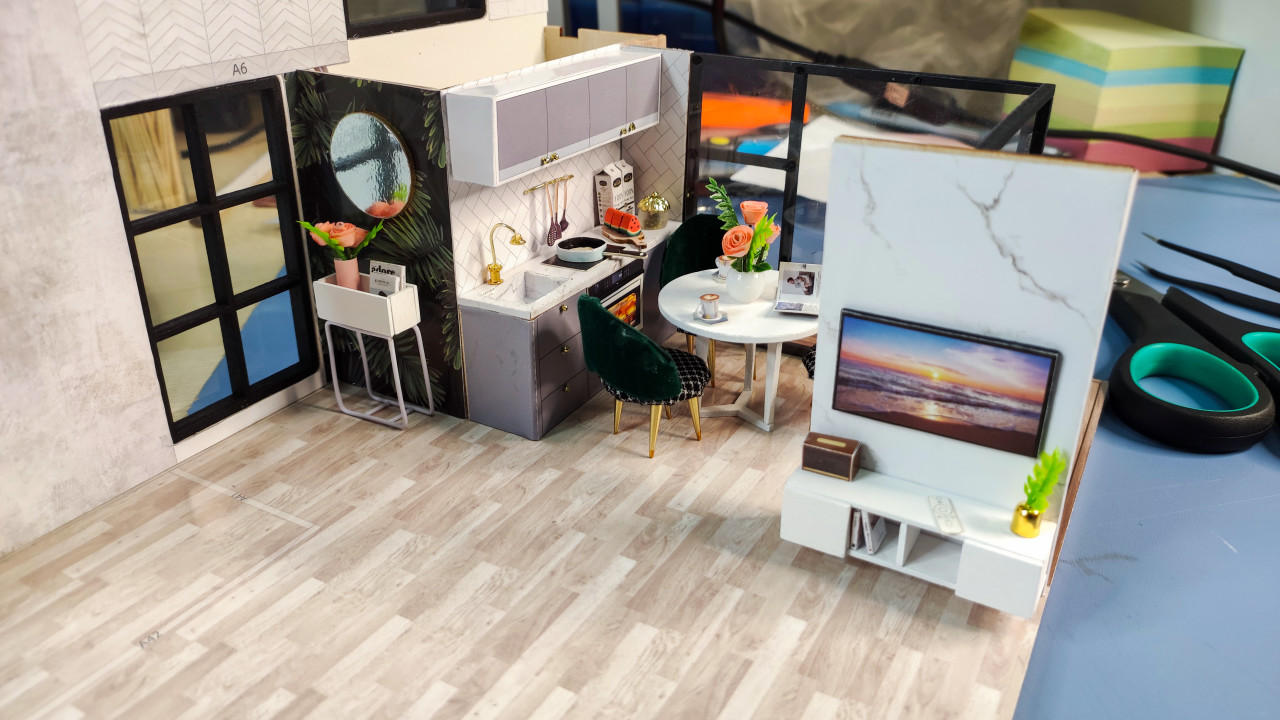 На фото изображена детализированная миниатюрная модель интерьера современной квартиры, включающая кухню и зону гостиной. В композиции видны миниатюрные предметы мебели: белый круглый стол, бархатные зелёные стулья, кухонные шкафы, раковина, телевизор с изображением заката и декоративные растения. Работа выполнена с высокой точностью, характерной для интерьерных макетов и архитектурных моделей. Снимок может использоваться в статьях и презентациях по дизайну интерьеров, архитектурному моделированию и обучению макетированию.