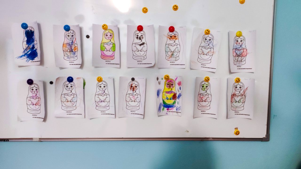 На фотографии показана белая магнитная доска, на которой закреплены детские раскрашенные рисунки матрёшек при помощи разноцветных магнитов. Каждый рисунок выполнен в индивидуальной манере, что отражает творческое развитие детей. Матрёшка — традиционная русская деревянная кукла, ставшая символом народного искусства. Сцена снята в учебном помещении, подходит для использования в образовательных и культурных материалах, посвящённых русским традициям, детскому творчеству и занятиям в детских садах.