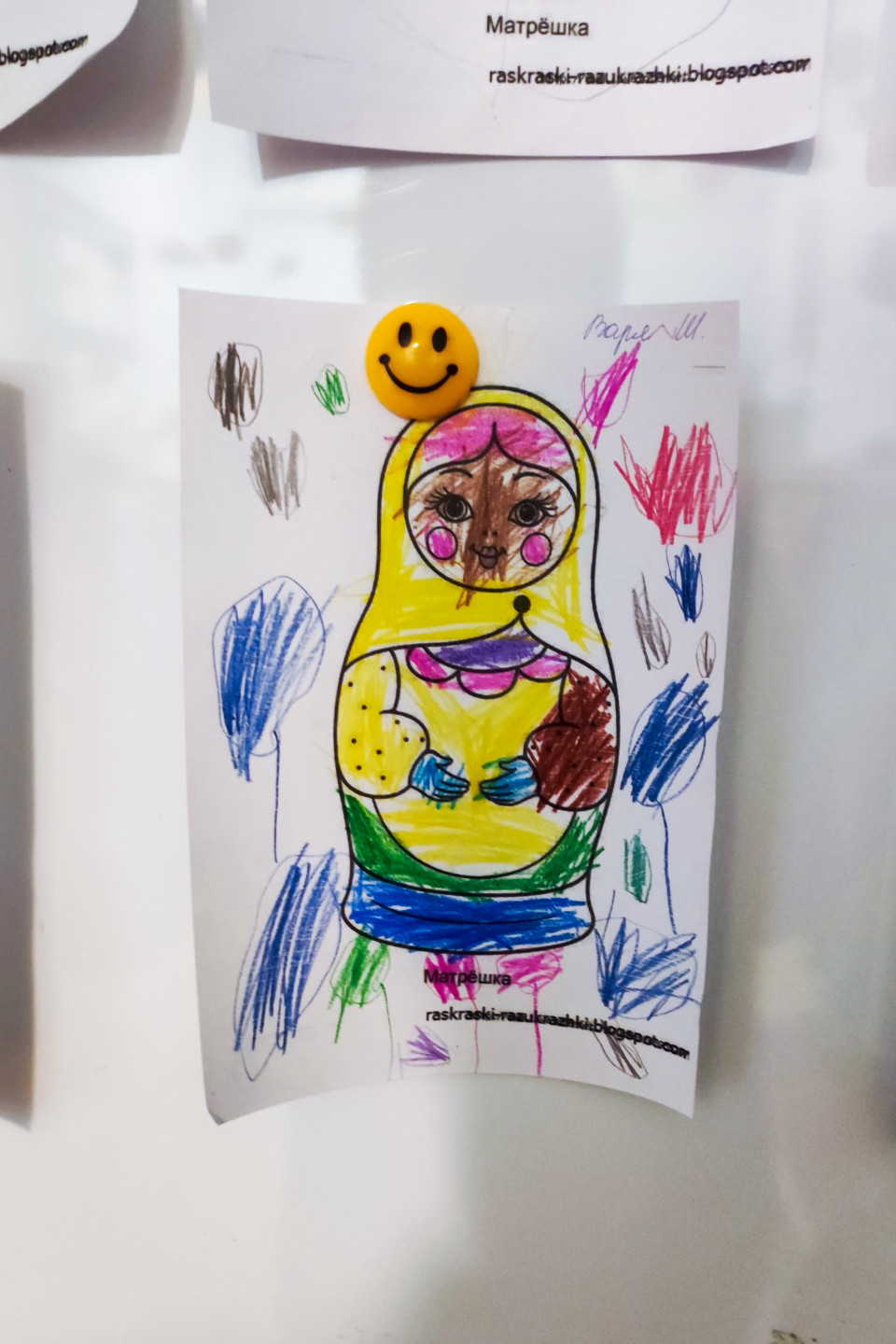 На фотографии изображён детский рисунок матрёшки, раскрашенный яркими карандашами и прикреплённый к магнитной доске с жёлтым смайликом. Матрёшка — символ русской культуры, известный с конца XIX века, когда её впервые создал художник Сергей Малютин. Работа выполнена ребёнком, отражая индивидуальное восприятие традиционного образа. Снимок можно использовать для материалов о народных промыслах, детском обучении и культурных традициях России.