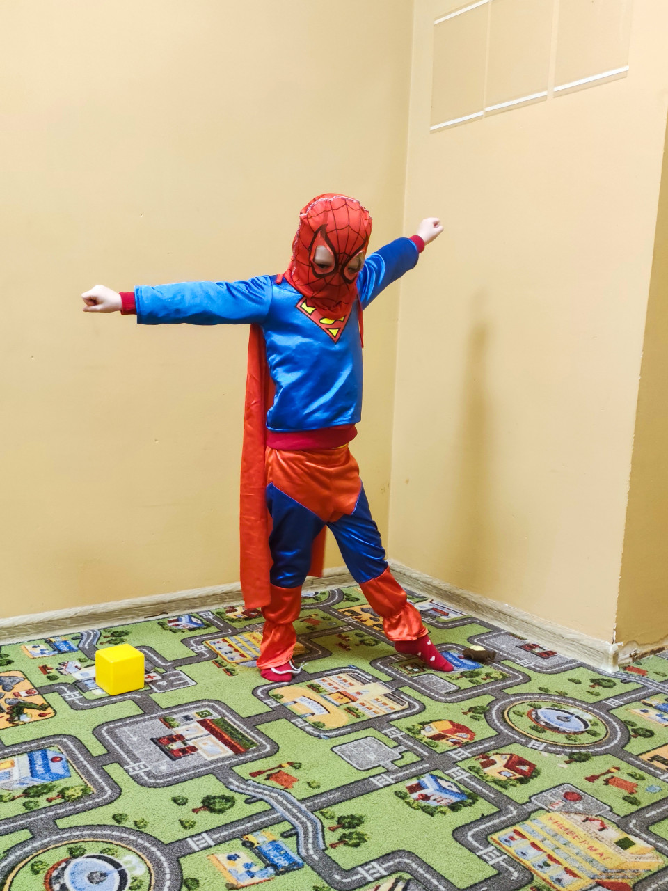На фотографии ребенок позирует в костюме супергероя, сочетающем элементы Супермена и Человека-паука. Он стоит на ковре с рисунком города, раскинув руки в стороны, изображая полет. Комната освещена теплым светом, стены окрашены в бежевый тон. Сцена отражает творческую игру и символизирует детское воображение. Фото можно использовать для иллюстраций о воспитании, праздниках и детском досуге.