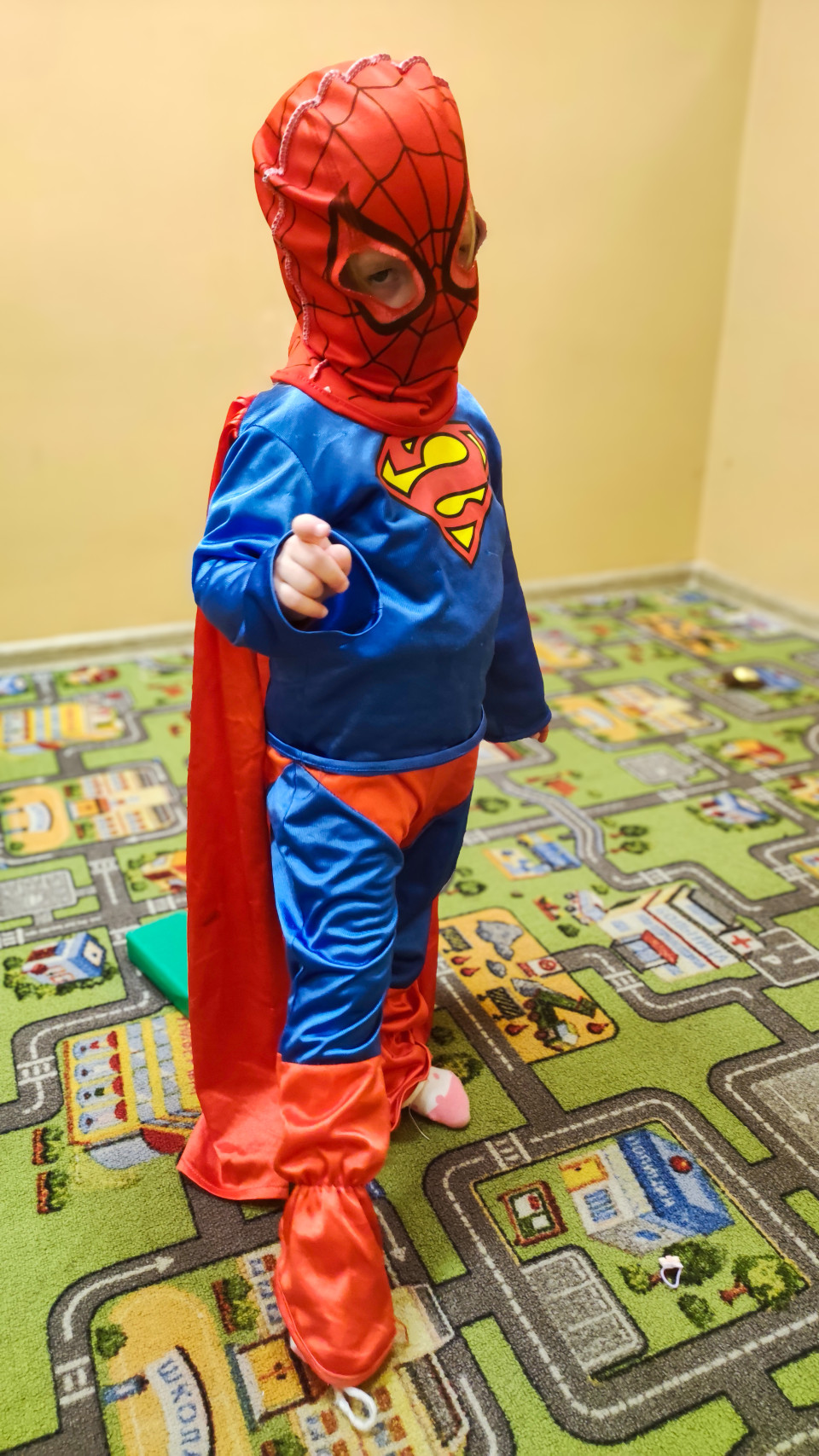На фотографии изображен ребенок в ярком костюме, сочетающем элементы Супермена и Человека-паука: синее трико с красной накидкой и маской. Съемка проведена в помещении с ковром, изображающим город с дорогами и зданиями. Желтая стена на фоне создает теплый контраст. Сцена отражает детскую игру и фантазию, объединяющую популярных супергероев. Подходит для иллюстраций о детстве, косплее и праздниках.