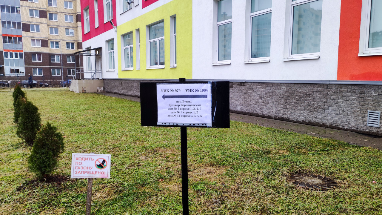 На фото показан указатель на территории современной школы с номерами избирательных участков №979 и №1004, расположенный на газоне перед фасадом. Здание оформлено в ярких цветах, рядом видна табличка «Ходить по газону запрещено». Сцена снята в период выборов Президента России в марте 2024 года. Кадр иллюстрирует организацию выборного процесса и благоустройство общественных территорий.