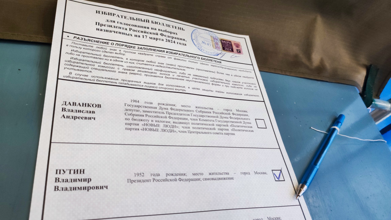 Фотография показывает бюллетень для голосования на выборах Президента Российской Федерации 2024 года, на котором сделана отметка напротив одного из кандидатов. Документ лежит на синем столе, рядом закреплена синяя ручка. На бланке виден штамп избирательного участка. Изображение передаёт официальную атмосферу избирательного процесса и может использоваться для тематических публикаций о выборах.