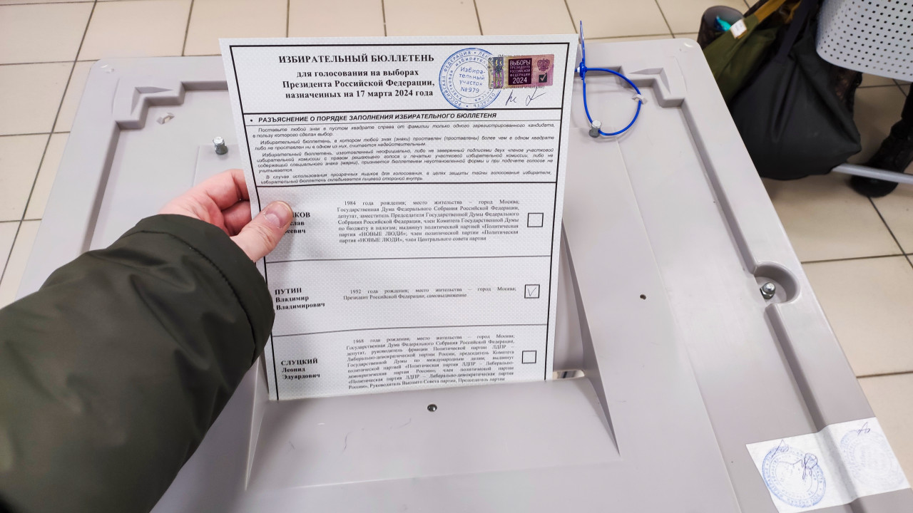 Избиратель опускает заполненный бюллетень в урну на выборах президента России 2024