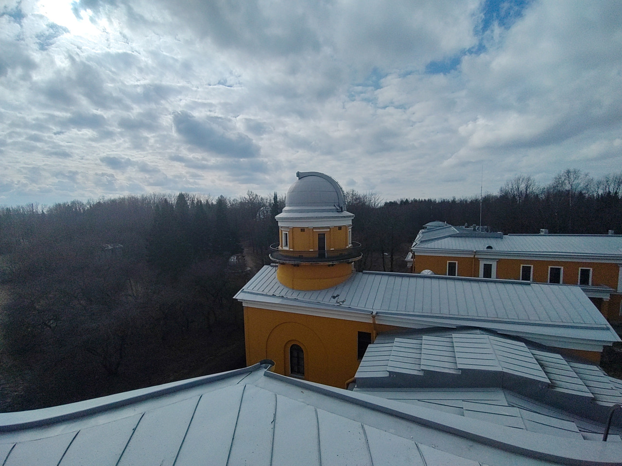 На фотографии изображено здание с круглым куполом, предназначенным для телескопа, являющееся частью архитектурного комплекса астрономической обсерватории. Постройка окрашена в жёлтый цвет с белыми элементами и имеет металлическую крышу. Вокруг расположены деревья и поля, на заднем плане виднеется лесной массив. Фото снято в дневное время при переменной облачности. Изображение подходит для публикаций о научных учреждениях и архитектуре XIX–XX веков.