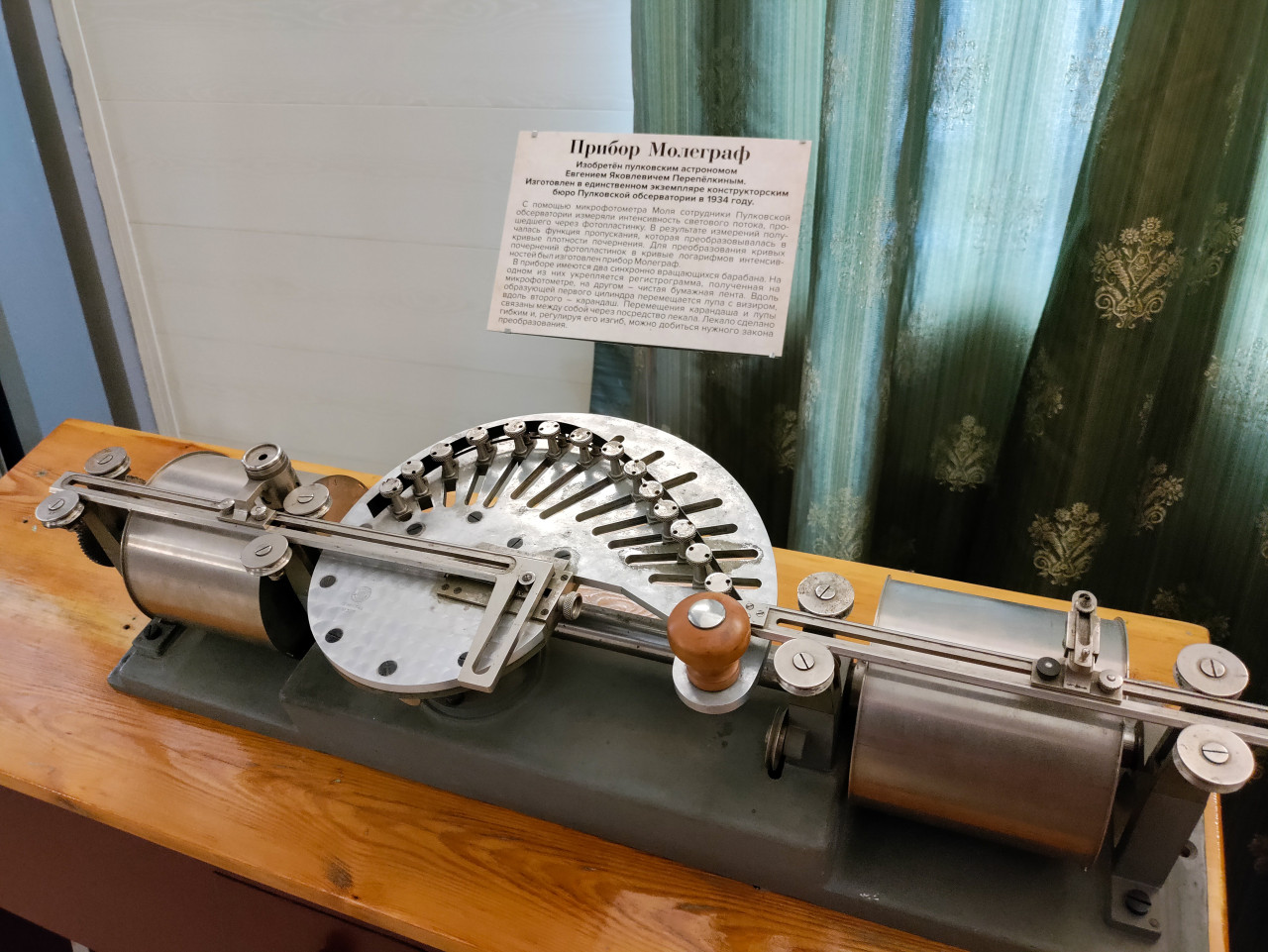 На фотографии изображён прибор «Молетраф», разработанный немецким астрономом Евгением Молем и изготовленный в ГАО Пулковской обсерватории в 1934 году. Устройство использовалось для преобразования графиков переменных звёзд в числовую форму и исследования интенсивности их блеска. Прибор выполнен из металла, имеет цилиндрические ролики и набор рычагов. Экспонат размещён на деревянной подставке и снабжён пояснительной табличкой. Снимок подходит для образовательных и научных публикаций.