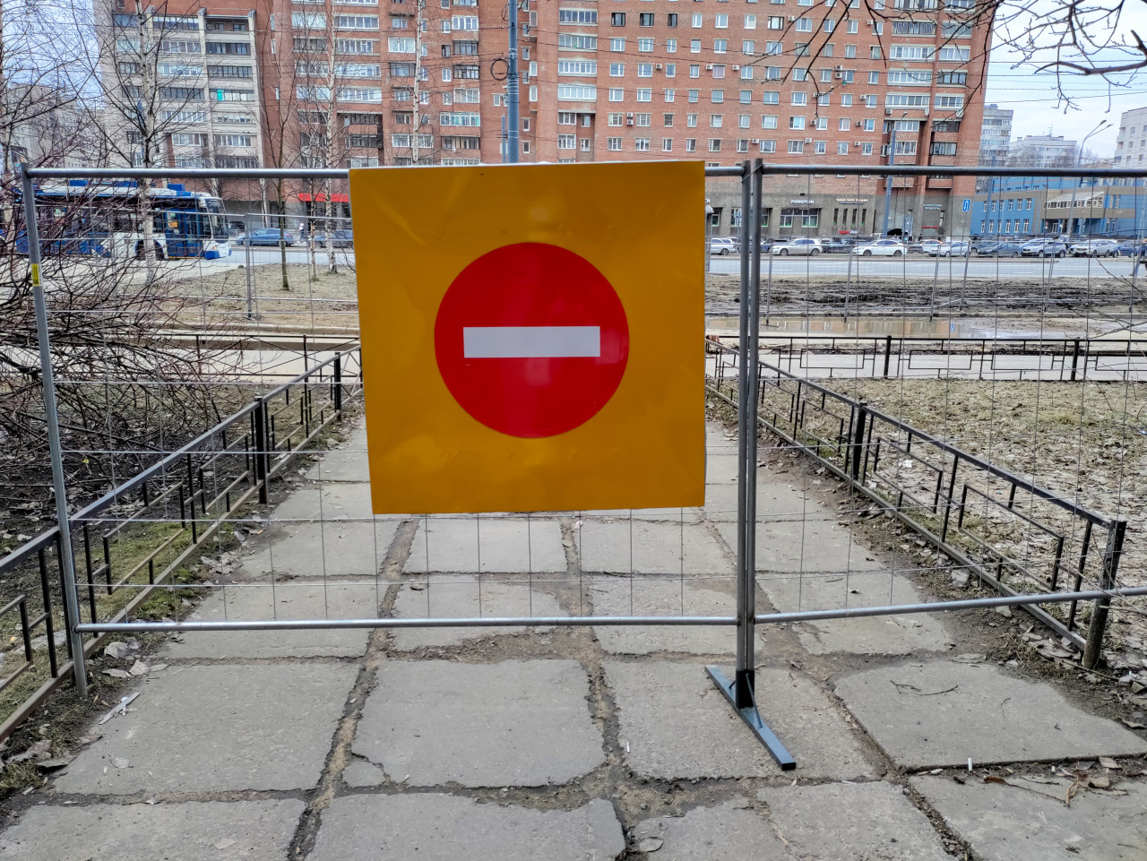 дорожный знак въезд запрещён дорожные работы ремонт безопасность ограждение пешеходная зона город инфраструктура благоустройство организация движения предупреждение строительство знак стройка движение транспорт правила уличная сцена тротуар жилые дома Россия временное перекрытие забор городской пейзаж ограничение указательПохожие фотографии