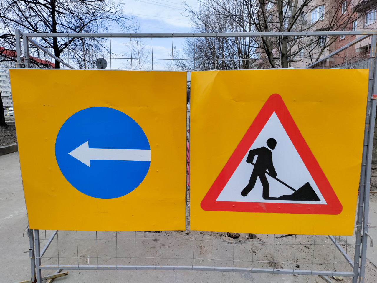 На фотографии изображены два временных дорожных знака, закреплённые на металлическом ограждении: синий круг со стрелкой влево, указывающей направление объезда, и треугольный знак «Дорожные работы». На заднем плане видны деревья без листвы, жилые дома и тротуар. Сцена снята в городской среде в период ремонта инженерных коммуникаций. Кадр можно использовать в публикациях о благоустройстве, транспортной безопасности, организации движения и строительных работах в жилых районах.