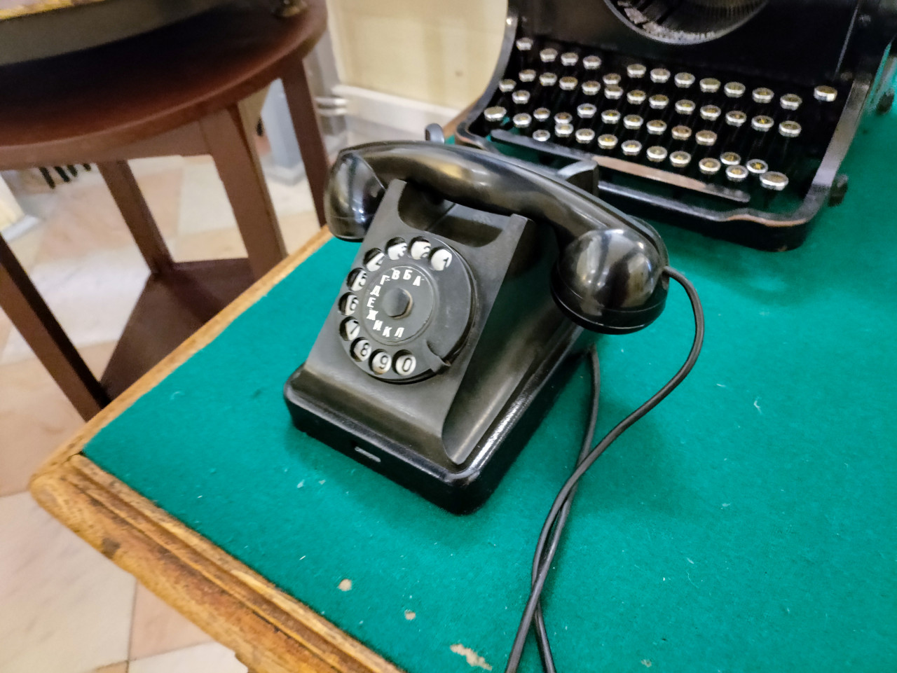 На изображении показан настольный телефон с дисковым номеронабирателем, относящийся к середине XX века. Устройство выполнено из чёрного пластика, установлено на зелёном суконном покрытии музейного стола. Рядом видна часть старинной печатной машинки. Экспонат демонстрирует эволюцию средств связи в СССР. Подобные телефоны использовались в государственных учреждениях и квартирах. Фотография подходит для иллюстраций о ретро-технике, истории связи и музейных экспозициях.