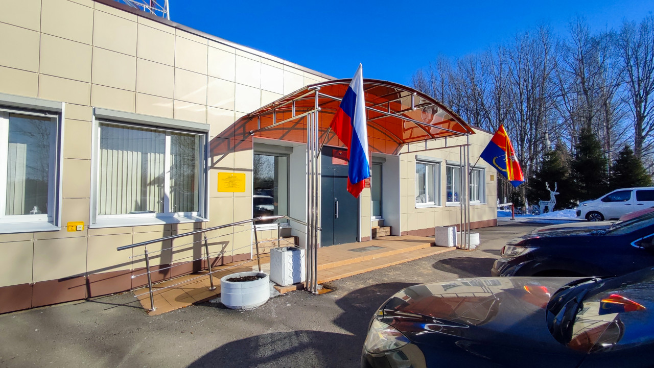 На изображении показано административное здание с подъездной зоной и парковкой для автомобилей на переднем плане. У входа закреплён государственный флаг и дополнительный флаг с ведомственной символикой. Перед дверью расположен пандус, обеспечивающий доступ маломобильных граждан. Около здания видны припаркованные машины и участок прилегающей территории. Снимок демонстрирует типовое решение входной зоны общественного учреждения и может использоваться в материалах о городской инфраструктуре, транспорте и организации приёма граждан.
