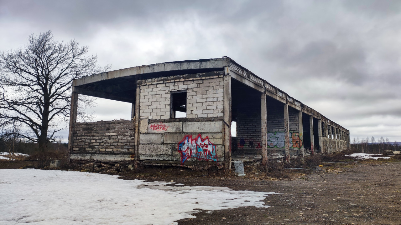 На фото изображено старое бетонное строение без окон и крыши, покрытое граффити. Стены частично разрушены, вокруг лежит снег и остатки мусора. Здание относится к типу советских производственных ангаров, распространённых на промышленных окраинах в середине XX века. На заднем плане виднеются деревья и равнинный пейзаж. Изображение можно использовать для иллюстрации тем урбанистики, индустриального наследия и реконструкции промзон.