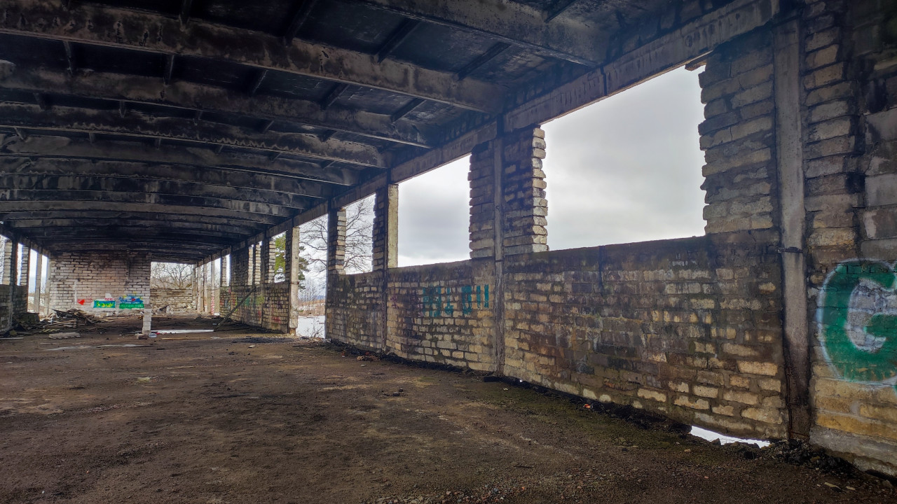 Внутренний вид разрушенного промышленного здания с кирпичными колоннами