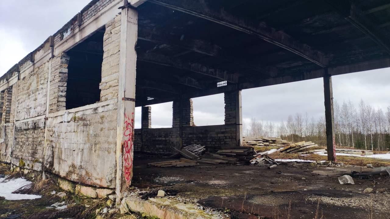 На фотографии изображено полуразрушенное промышленное строение из кирпича и бетона, частично лишённое стен и перекрытий. На переднем плане видны остатки строительных материалов и следы снега, по краям — выцветшие надписи и граффити на стенах. Судя по архитектуре, здание было возведено в середине XX века как часть советского промышленного комплекса. Снимок сделан в начале весны на окраине, где виднеются редкие берёзовые деревья и остатки снежного покрова. Подходит для использования в тематиках урбанизма, архитектурных исследований и индустриального наследия.