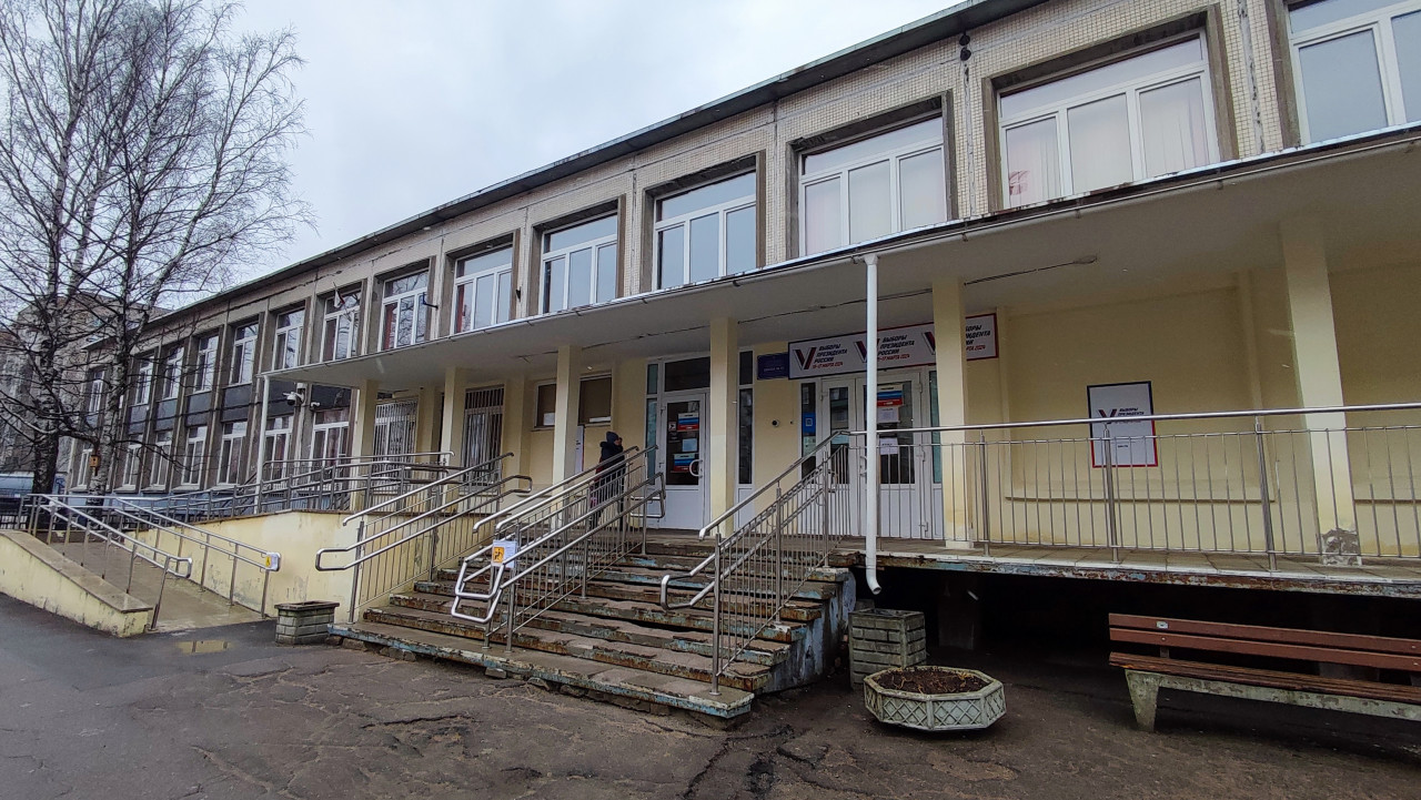 На фотографии изображено двухэтажное здание с пандусом и лестницей у входа, оборудованное перилами из нержавеющей стали. На фасаде установлены таблички, указывающие на работу избирательного участка. Видно, что фото сделано в пасмурный день, вероятно весной 2024 года. Архитектура типична для общественных зданий позднего советского периода. Изображение можно использовать для иллюстрации тем выборов, общественных пространств и доступной среды.