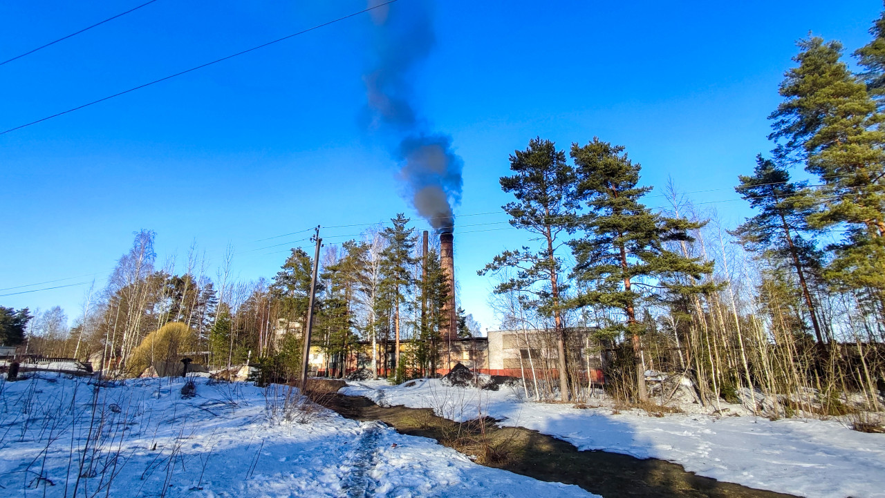 На фотографии изображена кирпичная дымовая труба промышленного предприятия, из которой поднимается густой черный дым. Здание завода частично скрыто за хвойными деревьями. На переднем плане лежит снег, виден утоптанный путь, ведущий к территории предприятия. Съемка выполнена в солнечный зимний день при ярком голубом небе. Сцена отражает тему промышленности и экологии в небольших российских населенных пунктах.