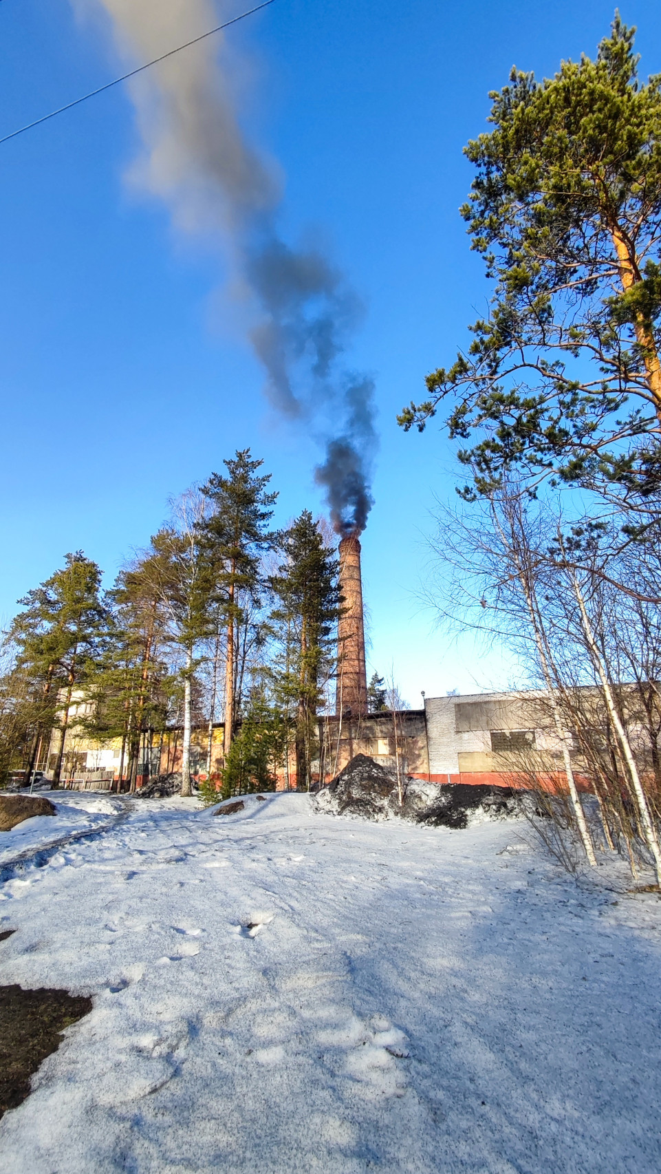 На фото изображена высокая кирпичная дымовая труба, из которой поднимается густой черный дым. Здание предприятия частично видно между соснами и березами. На земле лежит снег, местами протаявший. Съемка произведена в солнечный день, на переднем плане заметны тени деревьев. Фото иллюстрирует тему взаимодействия промышленности и природного окружения.