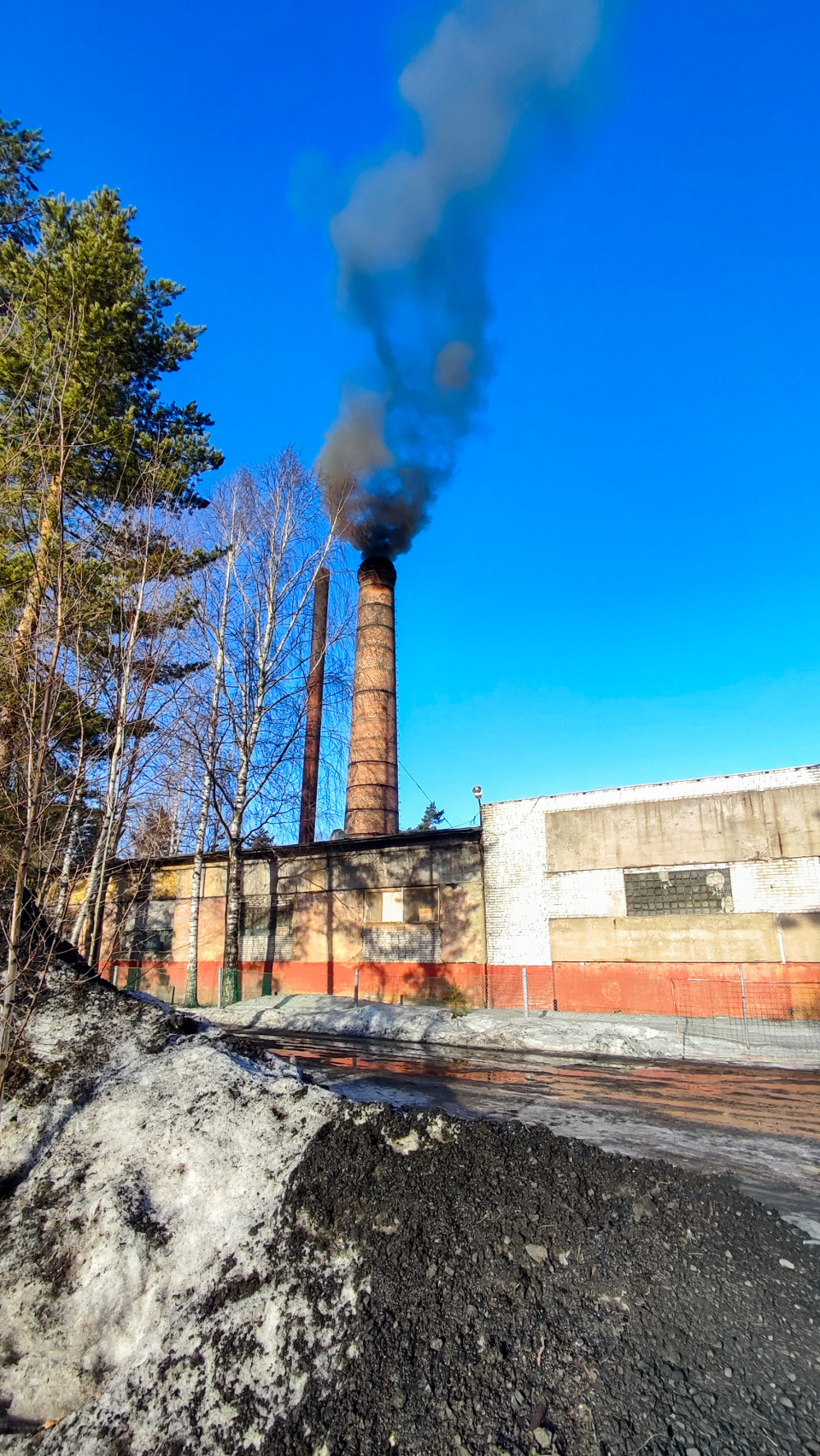 Фотография демонстрирует старое здание котельной с высокой кирпичной трубой, из которой поднимается черный дым. На земле лежит снег, частично покрытый следами копоти. На фоне — голубое небо и деревья, создающие контраст с индустриальной архитектурой. Судя по внешнему виду, объект построен в середине XX века и продолжает функционировать. Фото можно использовать в статьях о промышленных выбросах и экологической ситуации в городах.