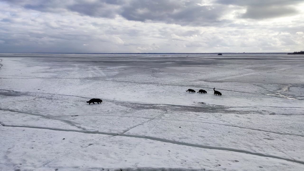 На фотографии изображён замёрзший Финский залив в районе Кронштадта. На льду, покрытом трещинами и снежными участками, движутся три кошки. На горизонте различимы берег и судно. Снимок передаёт контраст между дикой природой и городской средой северного побережья. Подходит для публикаций о животных, климате и сезонных явлениях в Санкт-Петербурге и на Балтике.