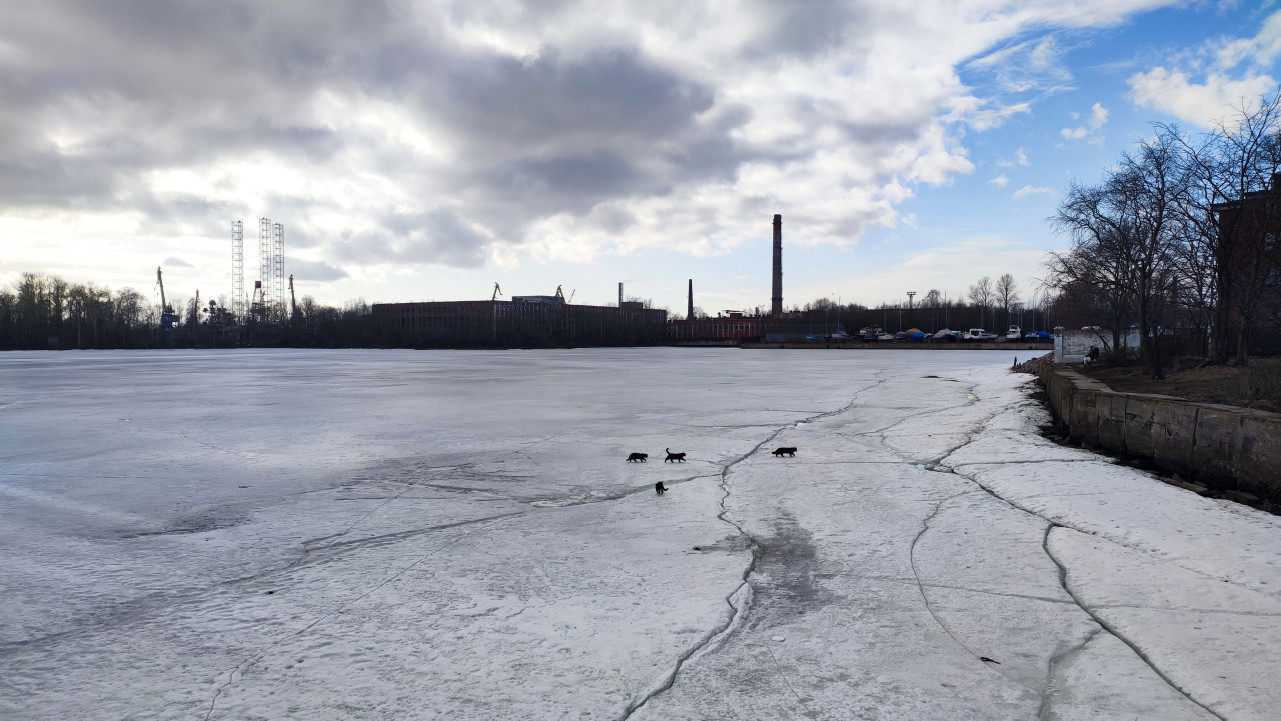На снимке изображена группа кошек, переходящих замерзшую реку или канал вблизи промышленной зоны. На фоне заметны краны и трубы, что указывает на судостроительное или машиностроительное предприятие. Лед покрыт трещинами и участками талой воды, небо затянуто облаками, но в просветах виден голубой цвет. Фотография отражает контраст между природой и индустриальной средой, подходит для материалов о городской экологии и жизни животных в промышленном окружении.