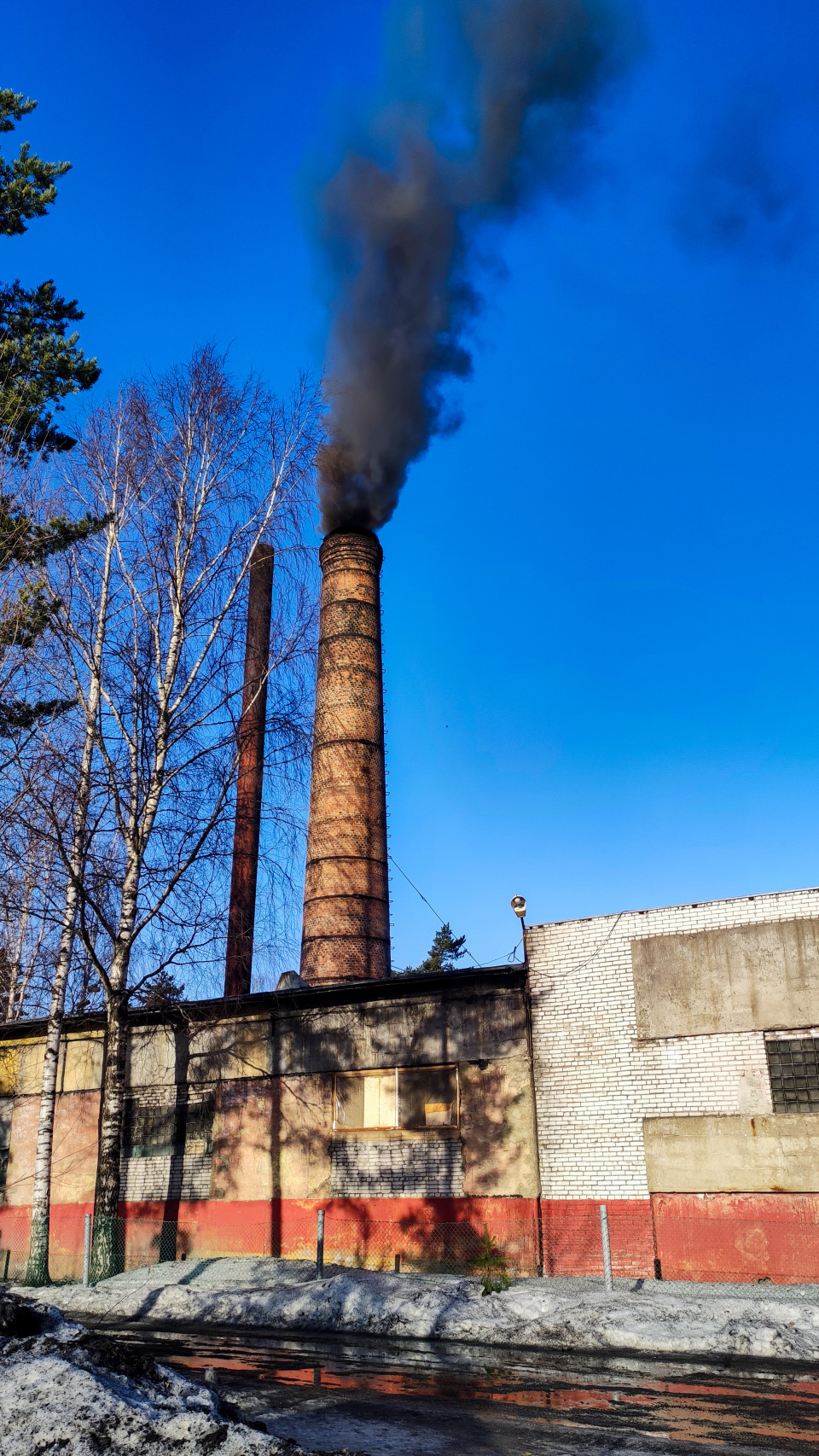 Фото показывает промышленную кирпичную трубу, из которой выходит густой черный дым. На переднем плане видна часть старого здания из кирпича и бетона с выцветшей окраской. Вокруг растут березы и хвойные деревья, а на земле — остатки снега. Судя по стилю постройки, объект принадлежит к советскому периоду, вероятно, середине XX века. Снимок можно использовать в материалах о промышленных выбросах, старых предприятиях и проблемах экологии.