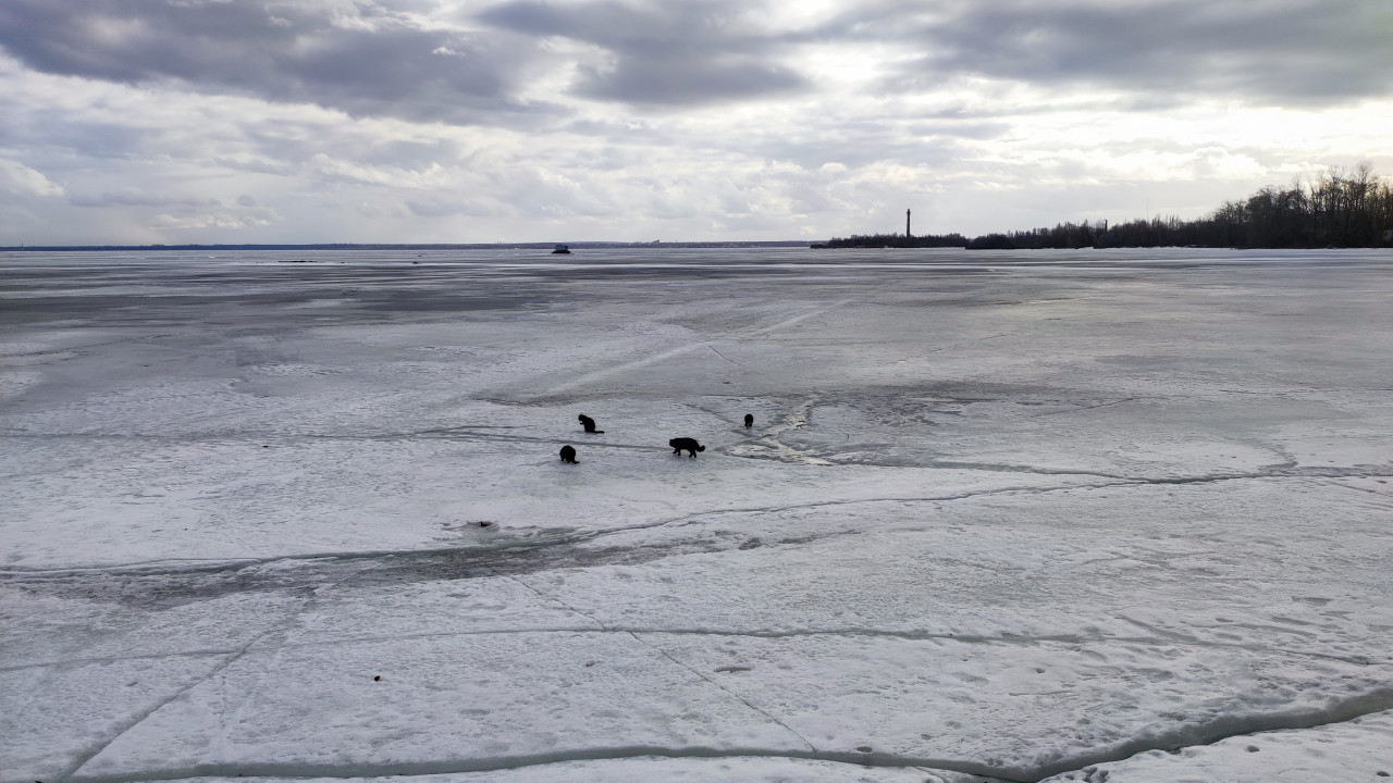 Фотография показывает несколько кошек, пересекающих ледяную поверхность залива, покрытого трещинами и лужами талой воды. На горизонте видна линия берега с промышленными объектами и высокой трубой, типичной для старых предприятий северных городов. Облачное небо и рассеянный свет подчеркивают холодную атмосферу ранней весны. Снимок передает тему выживания животных в городской среде и сезонного перехода.