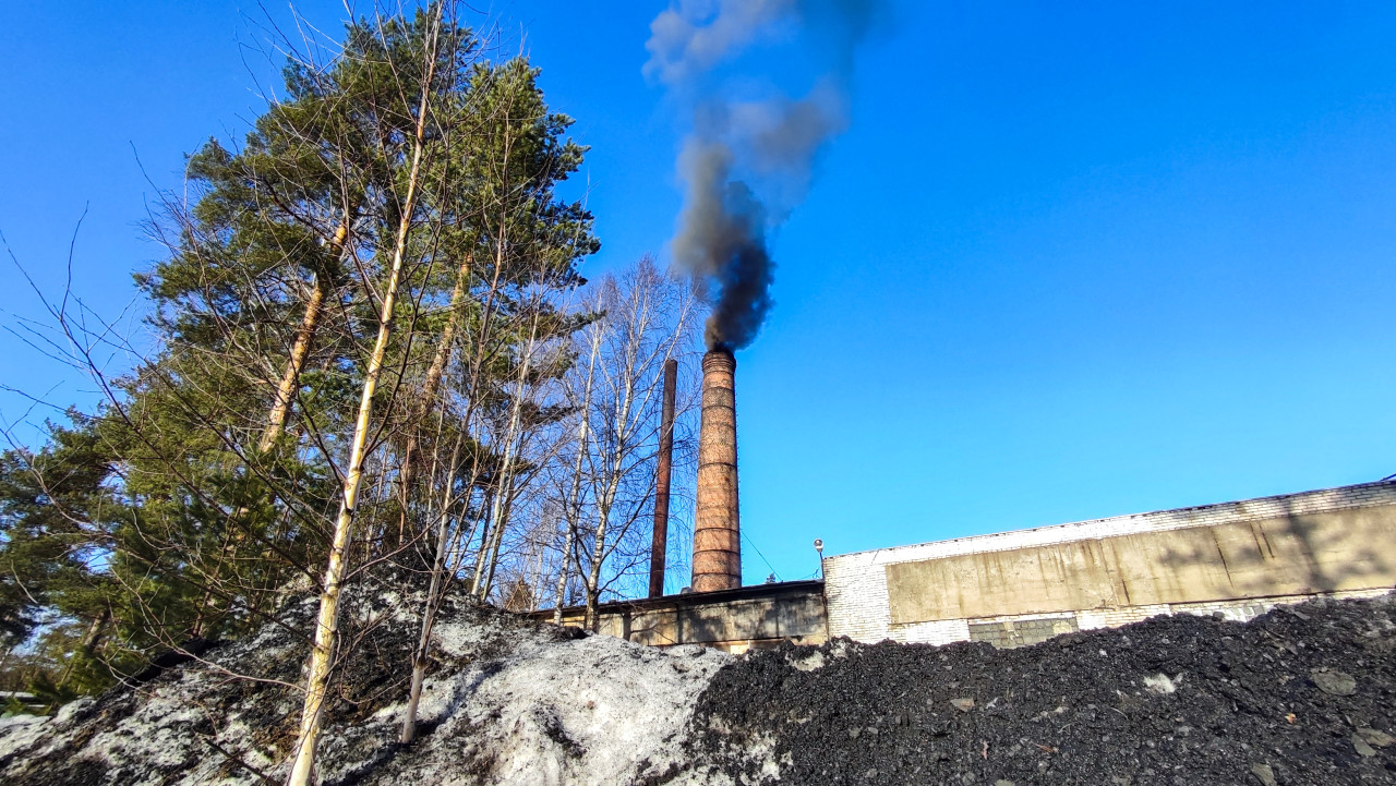 На фото изображена промышленная труба из кирпича, из которой поднимается густой черный дым. На переднем плане заметны остатки снега, перемешанные с угольной пылью. Слева в кадре — сосны и березы без листвы, на заднем плане — часть старого промышленного здания. Снимок сделан зимой при ярком солнечном свете. Фото отражает тему промышленного загрязнения воздуха и может быть использовано в экологических и документальных публикациях.