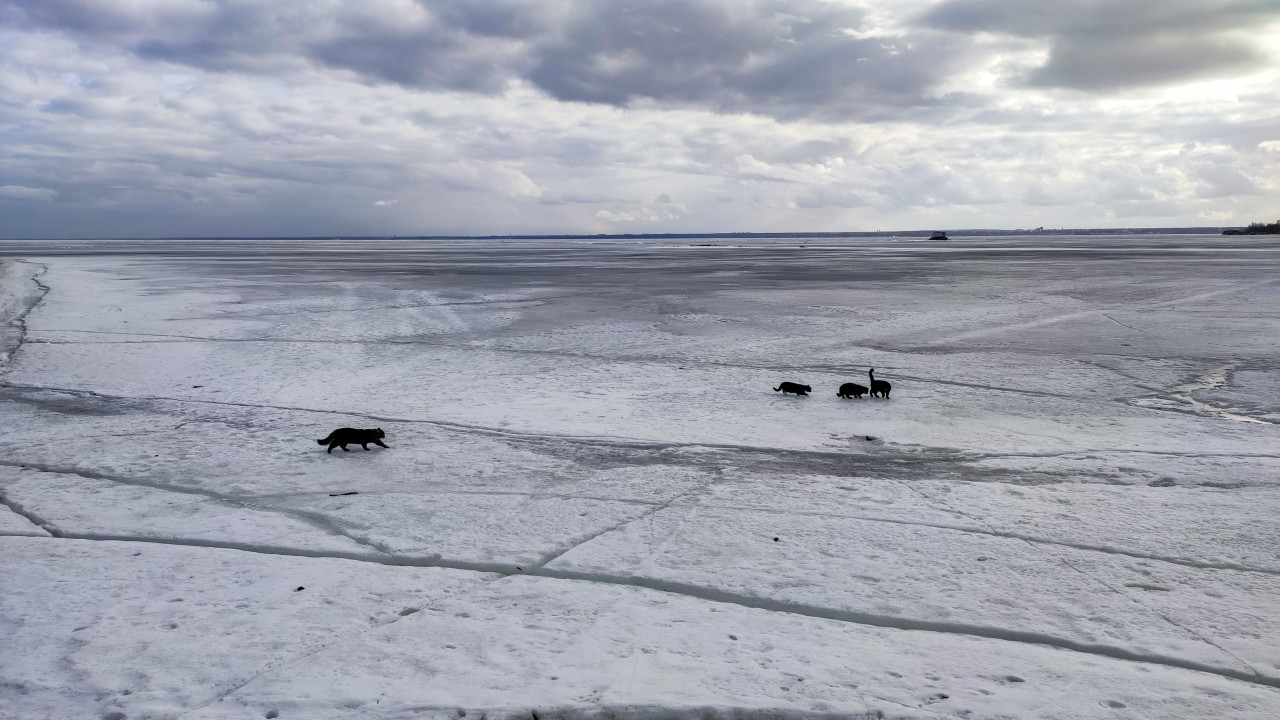 На снимке запечатлены четыре кошки, идущие по заснеженной поверхности замёрзшего Финского залива в районе Кронштадта. Лёд покрыт сетью трещин и снежными полосами. На горизонте виднеется судно и береговая линия. Фотография показывает редкий сюжет взаимодействия животных и северной природы. Подходит для публикаций о зиме, экологии, животных и климате Балтики.