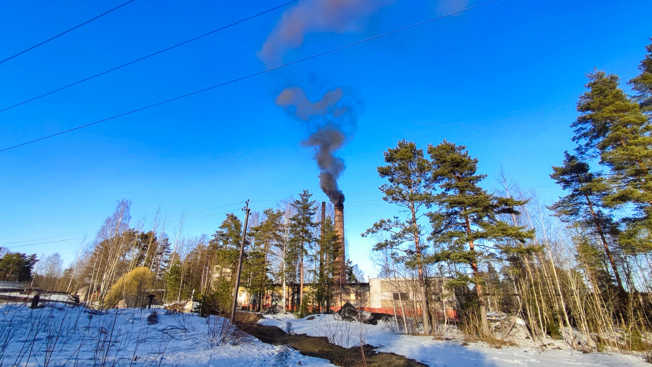 Фотография изображает старое промышленное здание с высокой кирпичной трубой, из которой поднимается черный дым. Вокруг строения растут сосны и березы, а земля покрыта снегом. На переднем плане — проселочная дорога и электрические провода. Снимок сделан днем при ярком небе. Этот кадр передает контраст между природой и индустрией, подчеркивая влияние промышленности на окружающую среду.