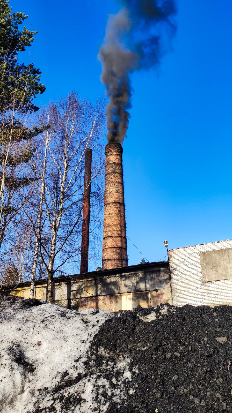 На изображении показано здание старой котельной с высокой кирпичной трубой, из которой идет черный дым. Перед зданием — снежная масса с угольной пылью и мусором. На заднем плане видны березы и сосны, а небо ярко-синее без облаков. Фото сделано в зимний день, при естественном солнечном освещении. Этот кадр может быть использован для тем, связанных с промышленными выбросами и состоянием окружающей среды.