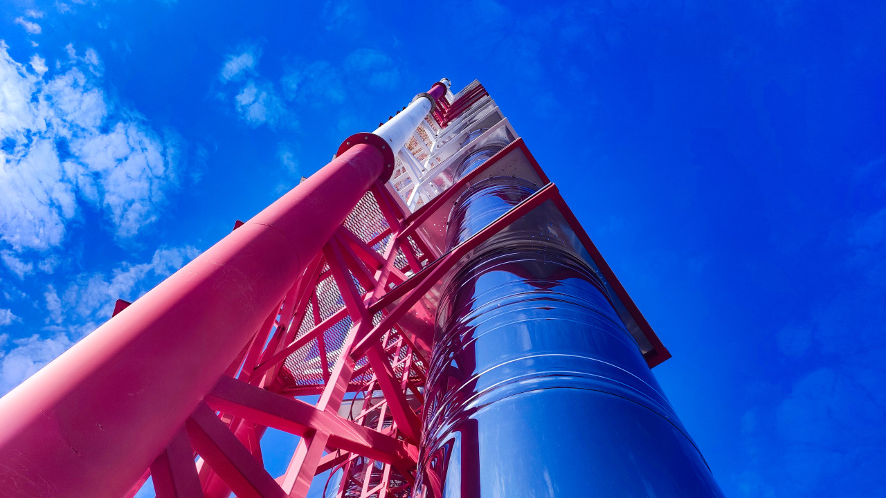 На снимке запечатлена высокая промышленная труба котельной, опирающаяся на металлическую ферму с красным покрытием. Полированные стальные цилиндры дымоходов отражают солнечный свет и небо. Фото сделано снизу вверх, подчёркивая масштаб и высоту сооружения. Подобные конструкции характерны для современных энергетических объектов, где важна эффективность отвода дымовых газов. Изображение можно использовать в материалах о промышленной архитектуре и энергетике.
