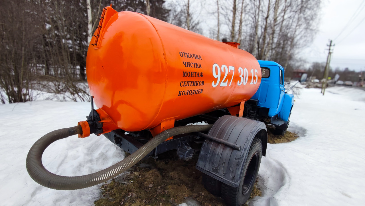 На фото изображён советский грузовик с ярко-оранжевой цистерной и синим кузовом, стоящий на заснеженной площадке. На цистерне нанесены надписи «откачка, чистка, монтаж септиков, колодцев» и номер телефона. Машина частично погружена в снег, а на фоне видны берёзы и еловые деревья, характерные для северных районов России. Снимок сделан зимой в пасмурную погоду. Изображение подходит для публикаций о коммунальной технике, транспорте советского периода и сезонных рабочих условиях.