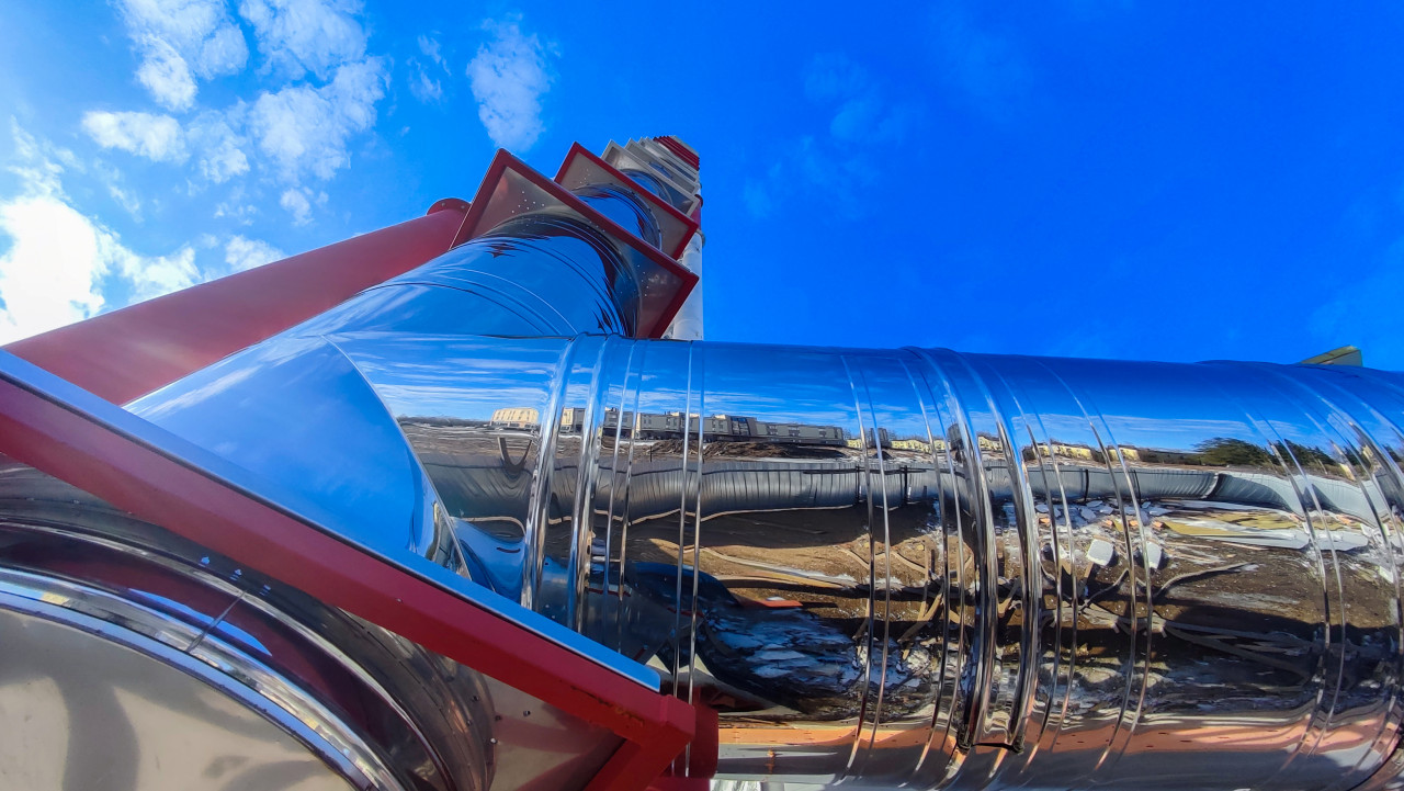 Снимок демонстрирует соединение отражающей трубы дымохода и вертикальной конструкции котельной. Нержавеющий металл отражает строящиеся здания и открытое небо. Видны болтовые соединения и элементы красной металлической фермы. Такое фото иллюстрирует инженерную эстетику и современные промышленные технологии. Используется в технических публикациях и архитектурных портфолио.