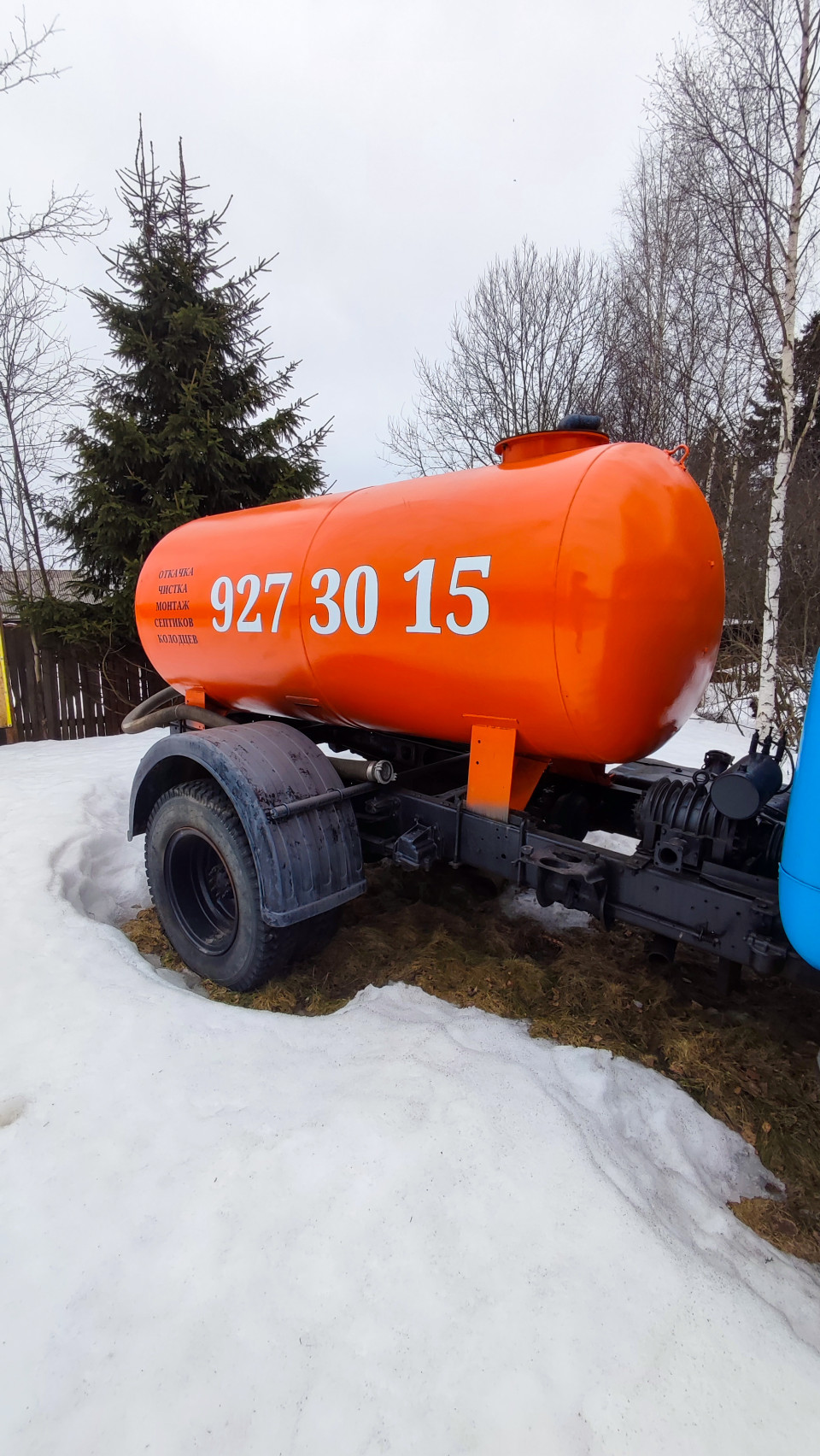 На фото изображён старый советский грузовик с оранжевой металлической цистерной и синим кузовом, стоящий на участке, частично покрытом снегом. На баке размещены надписи «откачка, чистка, монтаж септиков, колодцев» и номер телефона. Вокруг видны берёзы, ели и забор, типичные для сельской или пригородной местности России. Снимок сделан зимой, при пасмурной погоде. Изображение может использоваться для публикаций о коммунальной технике, сельском хозяйстве и транспортных услугах.
