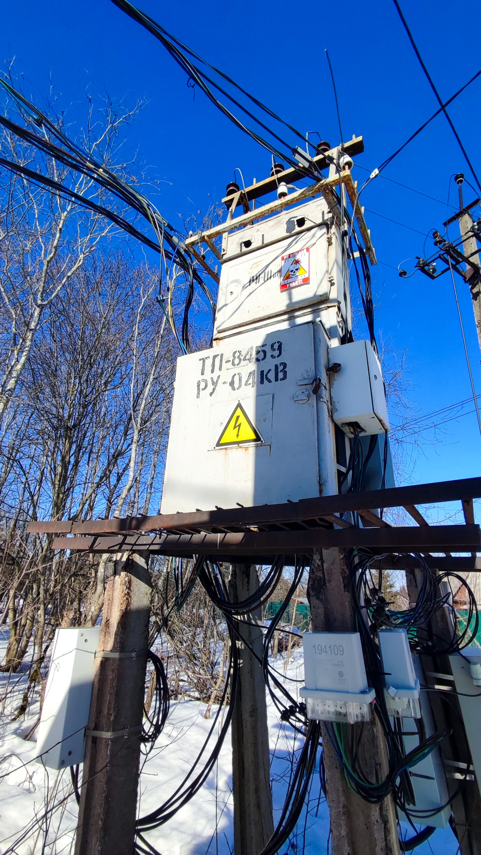 На фото видна трансформаторная подстанция, установленная на металлической эстакаде и питающая жилой сектор через воздушные линии электропередачи. По стойкам проходят кабели, ведущие к распределительным коробам, расположенным ниже. Такие подстанции применяются в небольших поселениях и садовых товариществах для понижения напряжения до бытового уровня. Снимок подходит для публикаций об энергосетях, распределении электроэнергии и инфраструктуре в малоэтажной застройке.