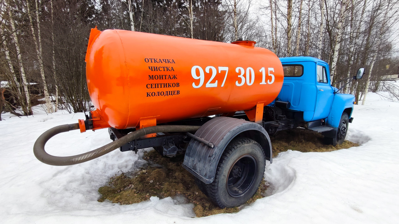 На снимке изображён коммунальный грузовик с вакуумной цистерной, предназначенной для откачки и чистки септиков и колодцев. Ярко-оранжевая цистерна контрастирует с синим кузовом автомобиля. Колёса частично утопают в снегу, под которым видна оттаявшая земля. На заднем плане — берёзовый лес и просёлочная дорога. Фото снято зимой, в пасмурную погоду. Изображение отражает эксплуатацию коммунальной техники в сезонных условиях.
