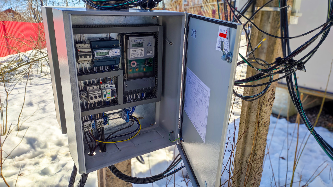 Электрощит с открытой дверцей на опоре в загородном посёлке