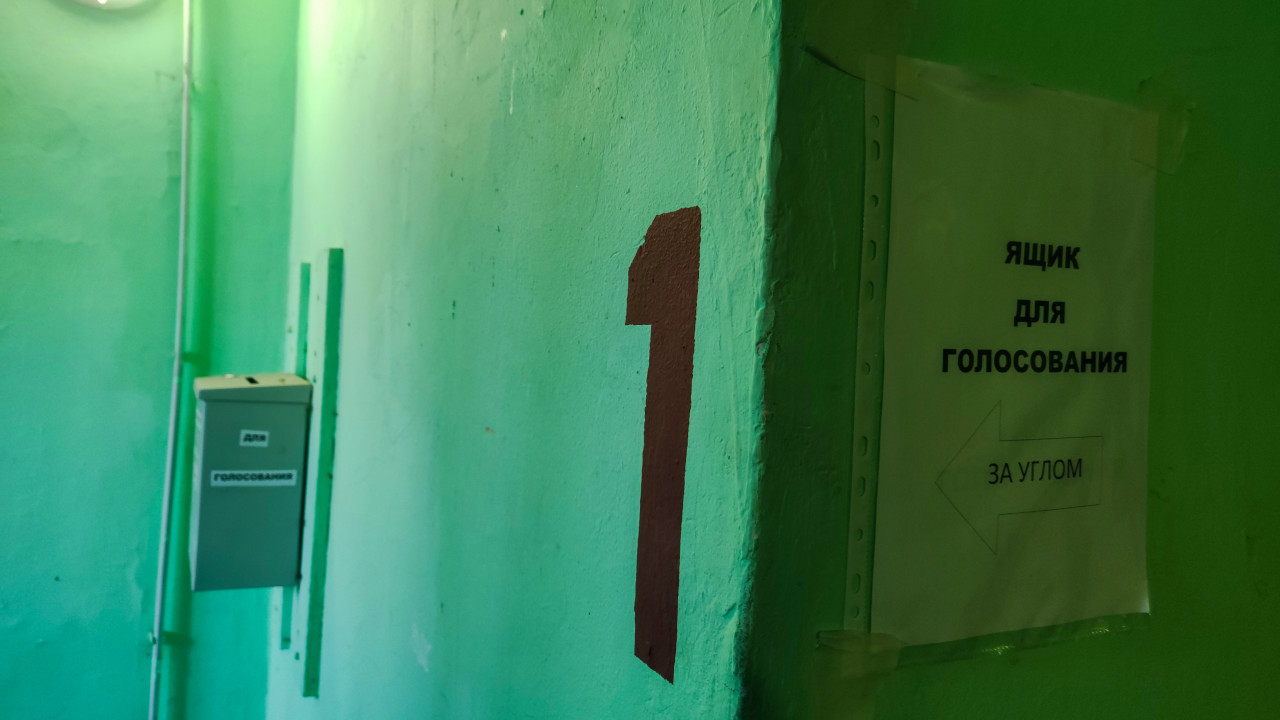 На снимке запечатлён зелёный коридор многоквартирного дома с крупной цифрой «1» на стене и указателем «ЯЩИК ДЛЯ ГОЛОСОВАНИЯ ЗА УГЛОМ». Металлический ящик для голосования прикреплён к стене слева. Стены выкрашены типичной для советских зданий зелёной краской. Атмосфера подчёркивает советский стиль и функциональность общественных пространств середины XX века. Фотография подходит для иллюстрации тем местного самоуправления, жилфонда и архитектуры массового строительства.