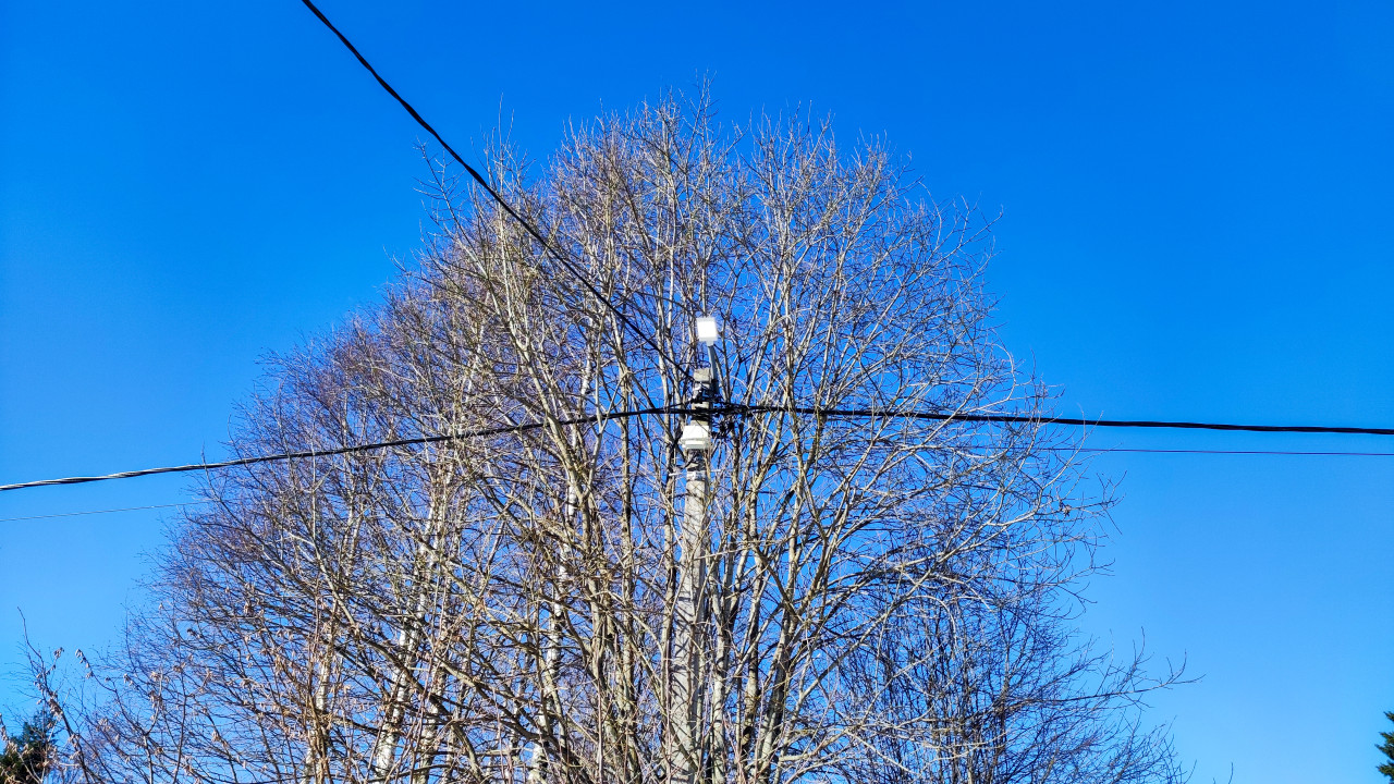 На изображении запечатлена верхняя часть электрической опоры с распределительными узлами и двумя светильниками, расположенная среди высоких лиственных деревьев без листвы. Через опору проходят несколько линий воздушных кабелей, которые расходятся в разные стороны, обеспечивая питание близлежащих строений в частном секторе. Яркое небо указывает на дневную зимнюю съёмку. Такой объект является типичным элементом инженерной инфраструктуры поселков и может использоваться в статьях о системах электроснабжения и освещения.